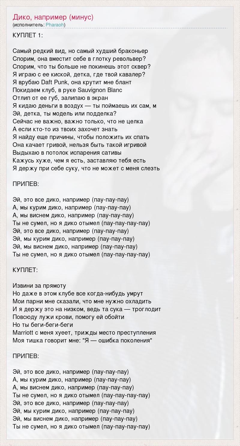 КУПЛЕТ 1: Самый редкий вид, но самый худший браконьер Спорим, она вместит себе в глотку револьвер? Спорим, что ты больше не покинешь этот сквер? Я играю с ее киской, детка, где твой кавалер? Я врубаю Daft Punk, она крутит мне блант Покидаем клуб, в руке Sauvignon Blanc Отлип от ее губ, залипаю в экран Я кидаю деньги в воздух — ты поймаешь их сам, м Эй, детка, ты модель или подделка? Сейчас не важно, важно только, что не целка А если кто-то из твоих захочет знать Я найду еще причины, чтобы положить их спать Она качает гривой, нельзя быть такой игривой Выдыхаю в потолок испарения сативы Кажусь хуже, чем я есть, заставляю тебя есть Я держу при себе суку, что не может с меня слезть ПРИПЕВ: Эй, это все дико, например (пау-пау-пау) А, мы курим дико, например (пау-пау-пау) А, мы виснем дико, например (пау-пау-пау) Ты не сумел, но я дико отымел (пау-пау-пау-пау) Эй, это все дико, например (пау-пау-пау) Эй, мы курим дико, например (пау-пау-пау) Эй, мы виснем дико, например (пау-пау-пау) Ты не сумел, но я дико отымел (пау-пау-пау-пау) КУПЛЕТ: Извини за прямоту Но даже в этом клубе все когда-нибудь умрут Мои парни мне сказали, что мне нужно охладить И я держу это на низком, ведь та сука — троглодит Повсюду лужи крови, помогу ей обойти Но ты беги-беги-беги Marriott с меня хуеет, трижды место преступления Моя тишка говорит мне: "Я — ошибка поколения" ПРИПЕВ: Эй, это все дико, например (пау-пау-пау) А, мы курим дико, например (пау-пау-пау) А, мы виснем дико, например (пау-пау-пау) Ты не сумел, но я дико отымел (пау-пау-пау-пау) Эй, это все дико, например (пау-пау-пау) Эй, мы курим дико, например (пау-пау-пау) Эй, мы виснем дико, например (пау-пау-пау) Ты не сумел, но я дико отымел (пау-пау-пау-пау)