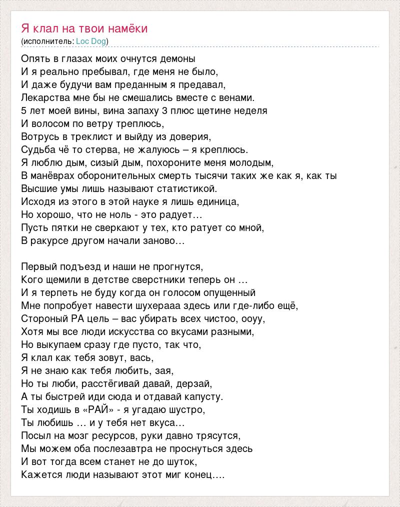 Опять в глазах моих очнутся демоны И я реально пребывал, где меня не было, И даже будучи вам преданным я предавал, Лекарства мне бы не смешались вместе с венами. 5 лет моей вины, вина запаху 3 плюс щетине неделя И волосом по ветру треплюсь, Вотрусь в треклист и выйду из доверия, Судьба чё то стерва, не жалуюсь – я креплюсь. Я люблю дым, сизый дым, похороните меня молодым, В манёврах оборонительных смерть тысячи таких же как я, как ты Высшие умы лишь называют статистикой. Исходя из этого в этой науке я лишь единица, Но хорошо, что не ноль - это радует… Пусть пятки не сверкают у тех, кто ратует со мной, В ракурсе другом начали заново… Первый подъезд и наши не прогнутся, Кого щемили в детстве сверстники теперь он … И я терпеть не буду когда он голосом опущенный Мне попробует навести шухерааа здесь или где-либо ещё, Стороный РА цель – вас убирать всех чистоо, ооуу, Хотя мы все люди искусства со вкусами разными, Но выкупаем сразу где пусто, так что, Я клал как тебя зовут, вась, Я не знаю как тебя любить, зая, Но ты люби, расстёгивай давай, дерзай, А ты быстрей иди сюда и отдавай капусту. Ты ходишь в «РАЙ» - я угадаю шустро, Ты любишь … и у тебя нет вкуса… Посыл на мозг ресурсов, руки давно трясутся, Мы можем оба послезавтра не проснуться здесь И вот тогда всем станет не до шуток, Кажется люди называют этот миг конец….