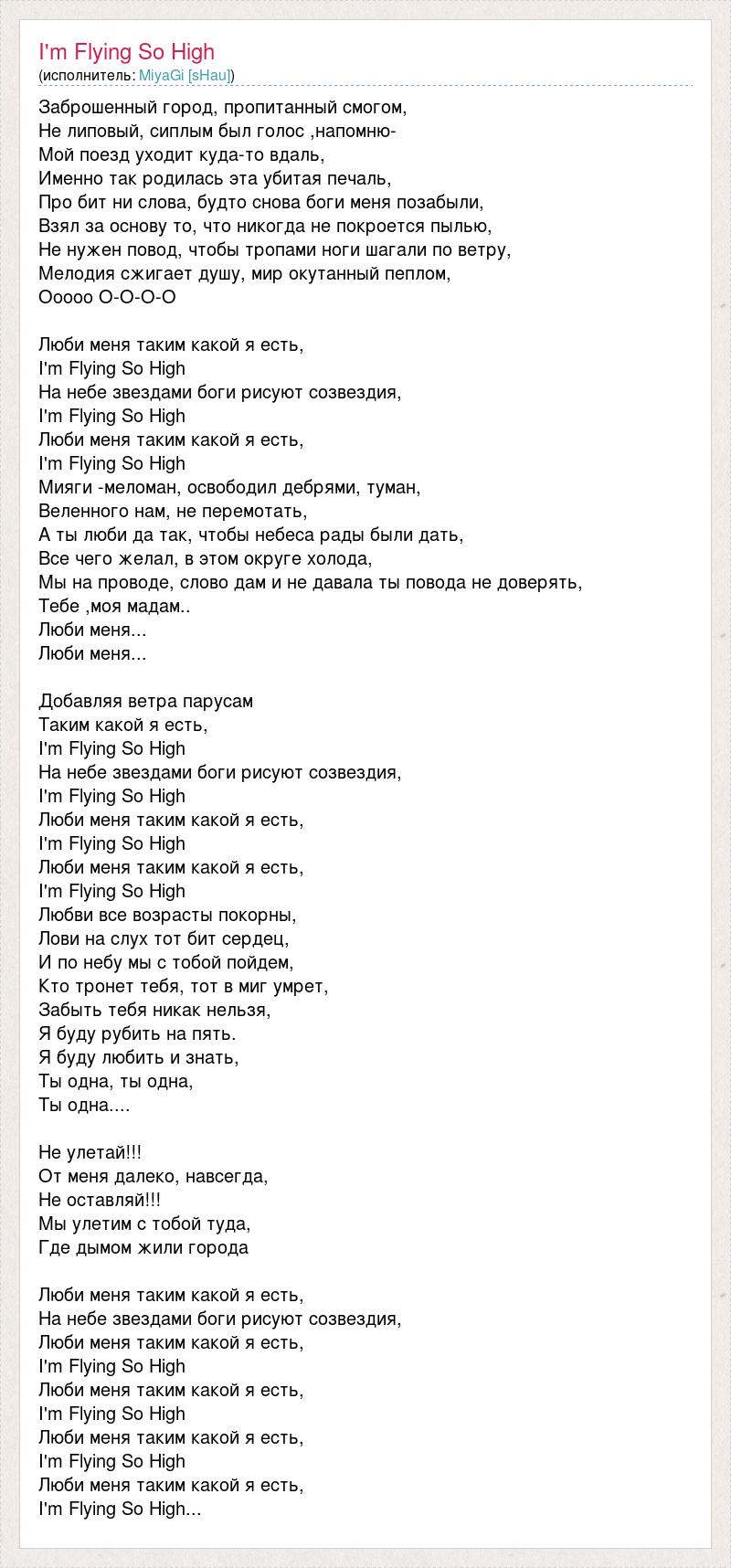 Заброшенный город, пропитанный смогом, Не липовый, сиплым был голос ,напомню- Мой поезд уходит куда-то вдаль, Именно так родилась эта убитая печаль, Про бит ни слова, будто снова боги меня позабыли, Взял за основу то, что никогда не покроется пылью, Не нужен повод, чтобы тропами ноги шагали по ветру, Мелодия сжигает душу, мир окутанный пеплом, Ооооо О-О-О-О Люби меня таким какой я есть, I'm Flying So High На небе звездами боги рисуют созвездия, I'm Flying So High Люби меня таким какой я есть, I'm Flying So High Мияги -меломан, освободил дебрями, туман, Веленного нам, не перемотать, А ты люби да так, чтобы небеса рады были дать, Все чего желал, в этом округе холода, Мы на проводе, слово дам и не давала ты повода не доверять, Тебе ,моя мадам.. Люби меня... Люби меня... Добавляя ветра парусам Таким какой я есть, I'm Flying So High На небе звездами боги рисуют созвездия, I'm Flying So High Люби меня таким какой я есть, I'm Flying So High Люби меня таким какой я есть, I'm Flying So High Любви все возрасты покорны, Лови на слух тот бит сердец, И по небу мы с тобой пойдем, Кто тронет тебя, тот в миг умрет, Забыть тебя никак нельзя, Я буду рубить на пять. Я буду любить и знать, Ты одна, ты одна, Ты одна.... Не улетай!!! От меня далеко, навсегда, Не оставляй!!! Мы улетим с тобой туда, Где дымом жили города Люби меня таким какой я есть, На небе звездами боги рисуют созвездия, Люби меня таким какой я есть, I'm Flying So High Люби меня таким какой я есть, I'm Flying So High Люби меня таким какой я есть, I'm Flying So High Люби меня таким какой я есть, I'm Flying So High...