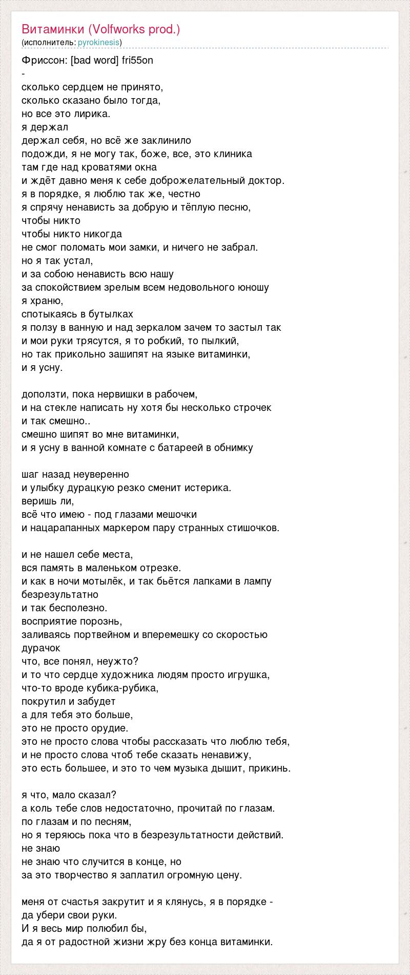 Фриссон: [bad word] fri55on - сколько сердцем не принято, сколько сказано было тогда, но все это лирика. я держал держал себя, но всё же заклинило подожди, я не могу так, боже, все, это клиника там где над кроватями окна и ждёт давно меня к себе доброжелательный доктор. я в порядке, я люблю так же, честно я спрячу ненависть за добрую и тёплую песню, чтобы никто чтобы никто никогда не смог поломать мои замки, и ничего не забрал. но я так устал, и за собою ненависть всю нашу за спокойствием зрелым всем недовольного юношу я храню, спотыкаясь в бутылках я ползу в ванную и над зеркалом зачем то застыл так и мои руки трясутся, я то робкий, то пылкий, но так прикольно зашипят на языке витаминки, и я усну. доползти, пока нервишки в рабочем, и на стекле написать ну хотя бы несколько строчек и так смешно.. смешно шипят во мне витаминки, и я усну в ванной комнате с батареей в обнимку шаг назад неуверенно и улыбку дурацкую резко сменит истерика. веришь ли, всё что имею - под глазами мешочки и нацарапанных маркером пару странных стишочков. и не нашел себе места, вся память в маленьком отрезке. и как в ночи мотылёк, и так бьётся лапками в лампу безрезультатно и так бесполезно. восприятие порознь, заливаясь портвейном и вперемешку со скоростью дурачок что, все понял, неужто? и то что сердце художника людям просто игрушка, что-то вроде кубика-рубика, покрутил и забудет а для тебя это больше, это не просто орудие. это не просто слова чтобы рассказать что люблю тебя, и не просто слова чтоб тебе сказать ненавижу, это есть большее, и это то чем музыка дышит, прикинь. я что, мало сказал? а коль тебе слов недостаточно, прочитай по глазам. по глазам и по песням, но я теряюсь пока что в безрезультатности действий. не знаю не знаю что случится в конце, но за это творчество я заплатил огромную цену. меня от счастья закрутит и я клянусь, я в порядке - да убери свои руки. И я весь мир полюбил бы, да я от радостной жизни жру без конца витаминки.
