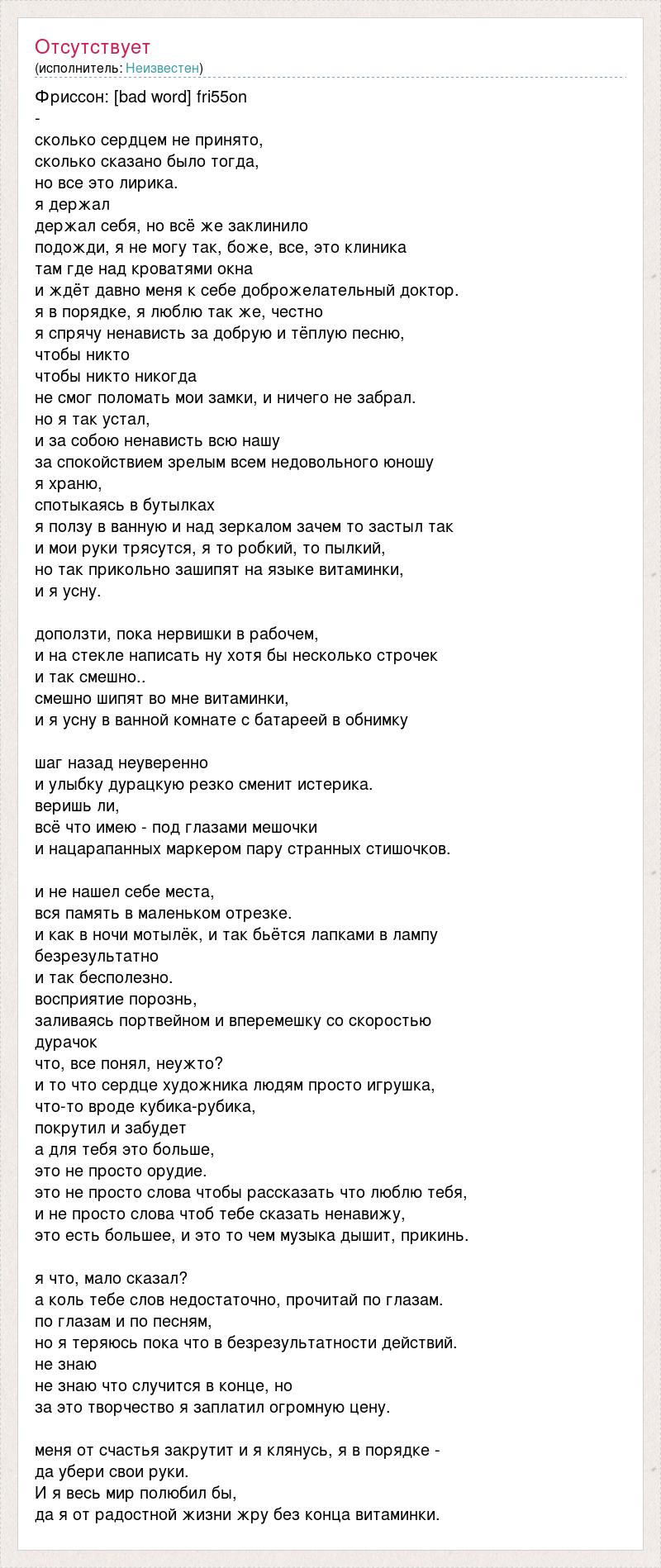 Фриссон: [bad word] fri55on - сколько сердцем не принято, сколько сказано было тогда, но все это лирика. я держал держал себя, но всё же заклинило подожди, я не могу так, боже, все, это клиника там где над кроватями окна и ждёт давно меня к себе доброжелательный доктор. я в порядке, я люблю так же, честно я спрячу ненависть за добрую и тёплую песню, чтобы никто чтобы никто никогда не смог поломать мои замки, и ничего не забрал. но я так устал, и за собою ненависть всю нашу за спокойствием зрелым всем недовольного юношу я храню, спотыкаясь в бутылках я ползу в ванную и над зеркалом зачем то застыл так и мои руки трясутся, я то робкий, то пылкий, но так прикольно зашипят на языке витаминки, и я усну. доползти, пока нервишки в рабочем, и на стекле написать ну хотя бы несколько строчек и так смешно.. смешно шипят во мне витаминки, и я усну в ванной комнате с батареей в обнимку шаг назад неуверенно и улыбку дурацкую резко сменит истерика. веришь ли, всё что имею - под глазами мешочки и нацарапанных маркером пару странных стишочков. и не нашел себе места, вся память в маленьком отрезке. и как в ночи мотылёк, и так бьётся лапками в лампу безрезультатно и так бесполезно. восприятие порознь, заливаясь портвейном и вперемешку со скоростью дурачок что, все понял, неужто? и то что сердце художника людям просто игрушка, что-то вроде кубика-рубика, покрутил и забудет а для тебя это больше, это не просто орудие. это не просто слова чтобы рассказать что люблю тебя, и не просто слова чтоб тебе сказать ненавижу, это есть большее, и это то чем музыка дышит, прикинь. я что, мало сказал? а коль тебе слов недостаточно, прочитай по глазам. по глазам и по песням, но я теряюсь пока что в безрезультатности действий. не знаю не знаю что случится в конце, но за это творчество я заплатил огромную цену. меня от счастья закрутит и я клянусь, я в порядке - да убери свои руки. И я весь мир полюбил бы, да я от радостной жизни жру без конца витаминки.