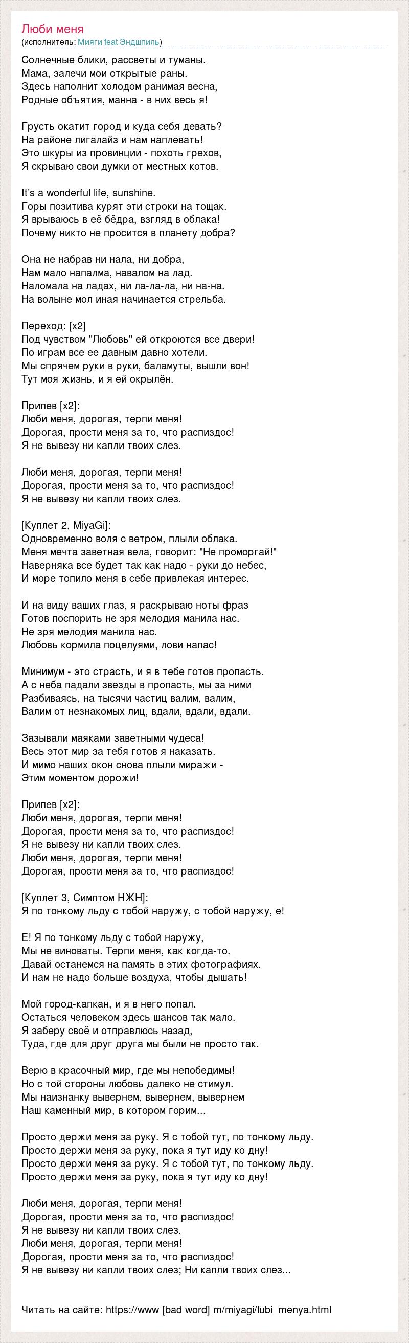 Солнечные блики, рассветы и туманы. Мама, залечи мои открытые раны. Здесь наполнит холодом ранимая весна, Родные объятия, манна - в них весь я! Грусть окатит город и куда себя девать? На районе лигалайз и нам наплевать! Это шкуры из провинции - похоть грехов, Я скрываю свои думки от местных котов. It’s a wonderful life, sunshine. Горы позитива курят эти строки на тощак. Я врываюсь в её бёдра, взгляд в облака! Почему никто не просится в планету добра? Она не набрав ни нала, ни добра, Нам мало напалма, навалом на лад. Наломала на ладах, ни ла-ла-ла, ни на-на. На волыне мол иная начинается стрельба. Переход: [х2] Под чувством "Любовь" ей откроются все двери! По играм все ее давным давно хотели. Мы спрячем руки в руки, баламуты, вышли вон! Тут моя жизнь, и я ей окрылён. Припев [х2]: Люби меня, дорогая, терпи меня! Дорогая, прости меня за то, что распиздос! Я не вывезу ни капли твоих слез. Люби меня, дорогая, терпи меня! Дорогая, прости меня за то, что распиздос! Я не вывезу ни капли твоих слез. [Куплет 2, MiyaGi]: Одновременно воля с ветром, плыли облака. Меня мечта заветная вела, говорит: "Не проморгай!" Наверняка все будет так как надо - руки до небес, И море топило меня в себе привлекая интерес. И на виду ваших глаз, я раскрываю ноты фраз Готов поспорить не зря мелодия манила нас. Не зря мелодия манила нас. Любовь кормила поцелуями, лови напас! Минимум - это страсть, и я в тебе готов пропасть. А с неба падали звезды в пропасть, мы за ними Разбиваясь, на тысячи частиц валим, валим, Валим от незнакомых лиц, вдали, вдали, вдали. Зазывали маяками заветными чудеса! Весь этот мир за тебя готов я наказать. И мимо наших окон снова плыли миражи - Этим моментом дорожи! Припев [х2]: Люби меня, дорогая, терпи меня! Дорогая, прости меня за то, что распиздос! Я не вывезу ни капли твоих слез. Люби меня, дорогая, терпи меня! Дорогая, прости меня за то, что распиздос! [Куплет 3, Симптом НЖН]: Я по тонкому льду с тобой наружу, с тобой наружу, е! Е! Я по тонкому льду с тобой наружу, Мы не виноваты. Терпи меня, как когда-то. Давай останемся на память в этих фотографиях. И нам не надо больше воздуха, чтобы дышать! Мой город-капкан, и я в него попал. Остаться человеком здесь шансов так мало. Я заберу своё и отправлюсь назад, Туда, где для друг друга мы были не просто так. Верю в красочный мир, где мы непобедимы! Но с той стороны любовь далеко не стимул. Мы наизнанку вывернем, вывернем, вывернем Наш каменный мир, в котором горим... Просто держи меня за руку. Я с тобой тут, по тонкому льду. Просто держи меня за руку, пока я тут иду ко дну! Просто держи меня за руку. Я с тобой тут, по тонкому льду. Просто держи меня за руку, пока я тут иду ко дну! Люби меня, дорогая, терпи меня! Дорогая, прости меня за то, что распиздос! Я не вывезу ни капли твоих слез. Люби меня, дорогая, терпи меня! Дорогая, прости меня за то, что распиздос! Я не вывезу ни капли твоих слез; Ни капли твоих слез... Читать на сайте: https://www [bad word] m/miyagi/lubi_menya.html