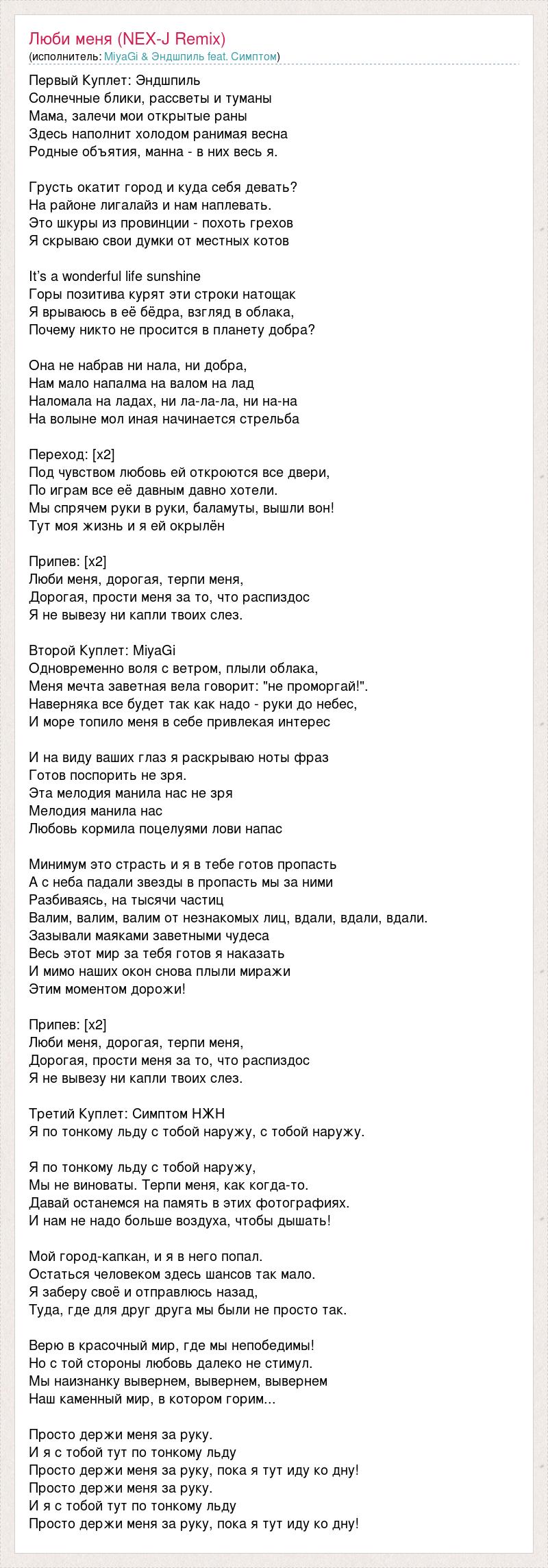 Первый Куплет: Эндшпиль Солнечные блики, рассветы и туманы Мама, залечи мои открытые раны Здесь наполнит холодом ранимая весна Родные объятия, манна - в них весь я. Грусть окатит город и куда себя девать? На районе лигалайз и нам наплевать. Это шкуры из провинции - похоть грехов Я скрываю свои думки от местных котов It’s a wonderful life sunshine Горы позитива курят эти строки натощак Я врываюсь в её бёдра, взгляд в облака, Почему никто не просится в планету добра? Она не набрав ни нала, ни добра, Нам мало напалма на валом на лад Наломала на ладах, ни ла-ла-ла, ни на-на На волыне мол иная начинается стрельба Переход: [х2] Под чувством любовь ей откроются все двери, По играм все её давным давно хотели. Мы спрячем руки в руки, баламуты, вышли вон! Тут моя жизнь и я ей окрылён Припев: [х2] Люби меня, дорогая, терпи меня, Дорогая, прости меня за то, что распиздос Я не вывезу ни капли твоих слез. Второй Куплет: MiyaGi Одновременно воля с ветром, плыли облака, Меня мечта заветная вела говорит: "не проморгай!". Наверняка все будет так как надо - руки до небес, И море топило меня в себе привлекая интерес И на виду ваших глаз я раскрываю ноты фраз Готов поспорить не зря. Эта мелодия манила нас не зря Мелодия манила нас Любовь кормила поцелуями лови напас Минимум это страсть и я в тебе готов пропасть А с неба падали звезды в пропасть мы за ними Разбиваясь, на тысячи частиц Валим, валим, валим от незнакомых лиц, вдали, вдали, вдали. Зазывали маяками заветными чудеса Весь этот мир за тебя готов я наказать И мимо наших окон снова плыли миражи Этим моментом дорожи! Припев: [х2] Люби меня, дорогая, терпи меня, Дорогая, прости меня за то, что распиздос Я не вывезу ни капли твоих слез. Третий Куплет: Симптом НЖН Я по тонкому льду с тобой наружу, с тобой наружу. Я по тонкому льду с тобой наружу, Мы не виноваты. Терпи меня, как когда-то. Давай останемся на память в этих фотографиях. И нам не надо больше воздуха, чтобы дышать! Мой город-капкан, и я в него попал. Остаться человеком здесь шансов так мало. Я заберу своё и отправлюсь назад, Туда, где для друг друга мы были не просто так. Верю в красочный мир, где мы непобедимы! Но с той стороны любовь далеко не стимул. Мы наизнанку вывернем, вывернем, вывернем Наш каменный мир, в котором горим... Просто держи меня за руку. И я с тобой тут по тонкому льду Просто держи меня за руку, пока я тут иду ко дну! Просто держи меня за руку. И я с тобой тут по тонкому льду Просто держи меня за руку, пока я тут иду ко дну!