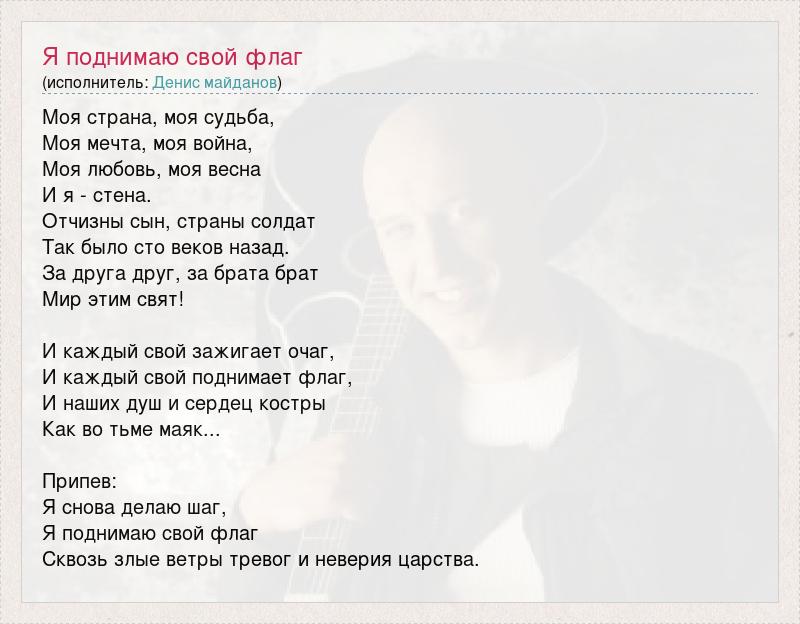 Моя страна, моя судьба, Моя мечта, моя война, Моя любовь, моя весна И я - стена. Отчизны сын, страны солдат Так было сто веков назад. За друга друг, за брата брат Мир этим свят! И каждый свой зажигает очаг, И каждый свой поднимает флаг, И наших душ и сердец костры Как во тьме маяк... Припев: Я снова делаю шаг, Я поднимаю свой флаг Сквозь злые ветры тревог и неверия царства.