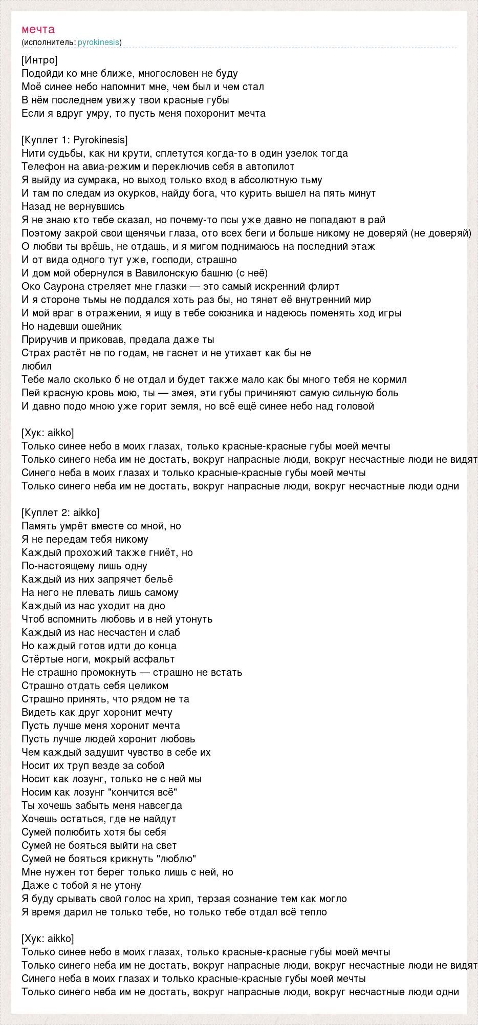 [Интро] Подойди ко мне ближе, многословен не буду Моё синее небо напомнит мне, чем был и чем стал В нём последнем увижу твои красные губы Если я вдруг умру, то пусть меня похоронит мечта [Куплет 1: Pyrokinesis] Нити судьбы, как ни крути, сплетутся когда-то в один узелок тогда Телефон на авиа-режим и переключив себя в автопилот Я выйду из сумрака, но выход только вход в абсолютную тьму И там по следам из окурков, найду бога, что курить вышел на пять минут Назад не вернувшись Я не знаю кто тебе сказал, но почему-то псы уже давно не попадают в рай Поэтому закрой свои щенячьи глаза, ото всех беги и больше никому не доверяй (не доверяй) О любви ты врёшь, не отдашь, и я мигом поднимаюсь на последний этаж И от вида одного тут уже, господи, страшно И дом мой обернулся в Вавилонскую башню (с неё) Око Саурона стреляет мне глазки — это самый искренний флирт И я стороне тьмы не поддался хоть раз бы, но тянет её внутренний мир И мой враг в отражении, я ищу в тебе союзника и надеюсь поменять ход игры Но надевши ошейник Приручив и приковав, предала даже ты Страх растёт не по годам, не гаснет и не утихает как бы не любил Тебе мало сколько б не отдал и будет также мало как бы много тебя не кормил Пей красную кровь мою, ты — змея, эти губы причиняют самую сильную боль И давно подо мною уже горит земля, но всё ещё синее небо над головой [Хук: aikko] Только синее небо в моих глазах, только красные-красные губы моей мечты Только синего неба им не достать, вокруг напрасные люди, вокруг несчастные люди не видят Синего неба в моих глазах и только красные-красные губы моей мечты Только синего неба им не достать, вокруг напрасные люди, вокруг несчастные люди одни [Куплет 2: aikko] Память умрёт вместе со мной, но Я не передам тебя никому Каждый прохожий также гниёт, но По-настоящему лишь одну Каждый из них запрячет бельё На него не плевать лишь самому Каждый из нас уходит на дно Чтоб вспомнить любовь и в ней утонуть Каждый из нас несчастен и слаб Но каждый готов идти до конца Стёртые ноги, мокрый асфальт Не страшно промокнуть — страшно не встать Страшно отдать себя целиком Страшно принять, что рядом не та Видеть как друг хоронит мечту Пусть лучше меня хоронит мечта Пусть лучше людей хоронит любовь Чем каждый задушит чувство в себе их Носит их труп везде за собой Носит как лозунг, только не с ней мы Носим как лозунг "кончится всё" Ты хочешь забыть меня навсегда Хочешь остаться, где не найдут Сумей полюбить хотя бы себя Сумей не бояться выйти на свет Сумей не бояться крикнуть "люблю" Мне нужен тот берег только лишь с ней, но Даже с тобой я не утону Я буду срывать свой голос на хрип, терзая сознание тем как могло Я время дарил не только тебе, но только тебе отдал всё тепло [Хук: aikko] Только синее небо в моих глазах, только красные-красные губы моей мечты Только синего неба им не достать, вокруг напрасные люди, вокруг несчастные люди не видят Синего неба в моих глазах и только красные-красные губы моей мечты Только синего неба им не достать, вокруг напрасные люди, вокруг несчастные люди одни