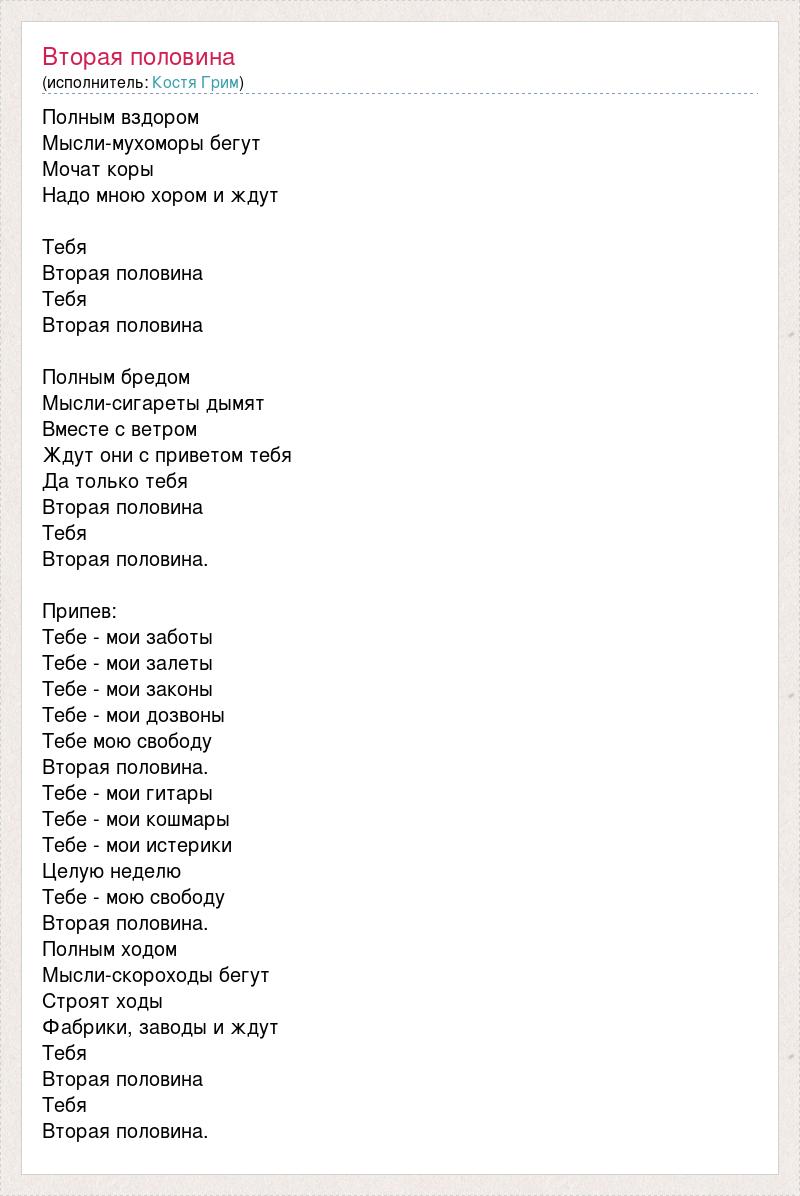 Полным вздором Мысли-мухоморы бегут Мочат коры Надо мною хором и ждут Тебя Вторая половина Тебя Вторая половина Полным бредом Мысли-сигареты дымят Вместе с ветром Ждут они с приветом тебя Да только тебя Вторая половина Тебя Вторая половина. Припев: Тебе - мои заботы Тебе - мои залеты Тебе - мои законы Тебе - мои дозвоны Тебе мою свободу Вторая половина. Тебе - мои гитары Тебе - мои кошмары Тебе - мои истерики Целую неделю Тебе - мою свободу Вторая половина. Полным ходом Мысли-скороходы бегут Строят ходы Фабрики, заводы и ждут Тебя Вторая половина Тебя Вторая половина.