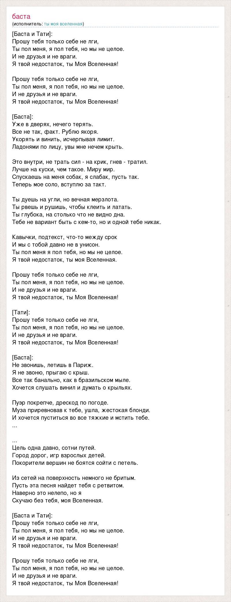 [Баста и Тати]: Прошу тебя только себе не лги, Ты пол меня, я пол тебя, но мы не целое. И не друзья и не враги. Я твой недостаток, ты Моя Вселенная! Прошу тебя только себе не лги, Ты пол меня, я пол тебя, но мы не целое. И не друзья и не враги. Я твой недостаток, ты Моя Вселенная! [Баста]: Уже в дверях, нечего терять. Все не так, факт. Рублю якоря. Укорять и винить, исчерпывая лимит. Ладонями по лицу, увы мне нечем крыть. Это внутри, не трать сил - на крик, гнев - тратил. Лучше на куски, чем такое. Миру мир. Спускаешь на меня собак, я слабак, пусть так. Теперь мое соло, вступлю за такт. Ты дуешь на угли, но вечная мерзлота. Ты рвешь и рушишь, чтобы клеить и латать. Ты глубока, на столько что не видно дна. Тебе не вариант быть с кем-то, но и одной тебе никак. Кавычки, подтекст, что-то между срок И мы с тобой давно не в унисон. Ты пол меня я пол тебя, но мы не целое. Я твой недостаток, ты моя Вселенная. Прошу тебя только себе не лги, Ты пол меня, я пол тебя, но мы не целое. И не друзья и не враги. Я твой недостаток, ты Моя Вселенная! [Тати]: Прошу тебя только себе не лги, Ты пол меня, я пол тебя, но мы не целое. И не друзья и не враги. Я твой недостаток, ты Моя Вселенная! [Баста]: Не звонишь, летишь в Париж. Я не звоню, прыгаю с крыш. Все так банально, как в бразильском мыле. Хочется слушать винил и думать о крыльях. Пуэр покрепче, дрескод по погоде. Муза приревновав к тебе, ушла, жестокая блонди. И хочется пуститься во все тяжкие и мстить тебе. ... ... Цель одна давно, сотни путей. Город дорог, игр взрослых детей. Покорители вершин не боятся сойти с петель. Из сетей на поверхность немного не бритым. Пусть эта песня найдет тебя с ретвитом. Наверно это нелепо, но я Скучаю без тебя, моя Вселенная. [Баста и Тати]: Прошу тебя только себе не лги, Ты пол меня, я пол тебя, но мы не целое. И не друзья и не враги. Я твой недостаток, ты Моя Вселенная! Прошу тебя только себе не лги, Ты пол меня, я пол тебя, но мы не целое. И не друзья и не враги. Я твой недостаток, ты Моя Вселенная!