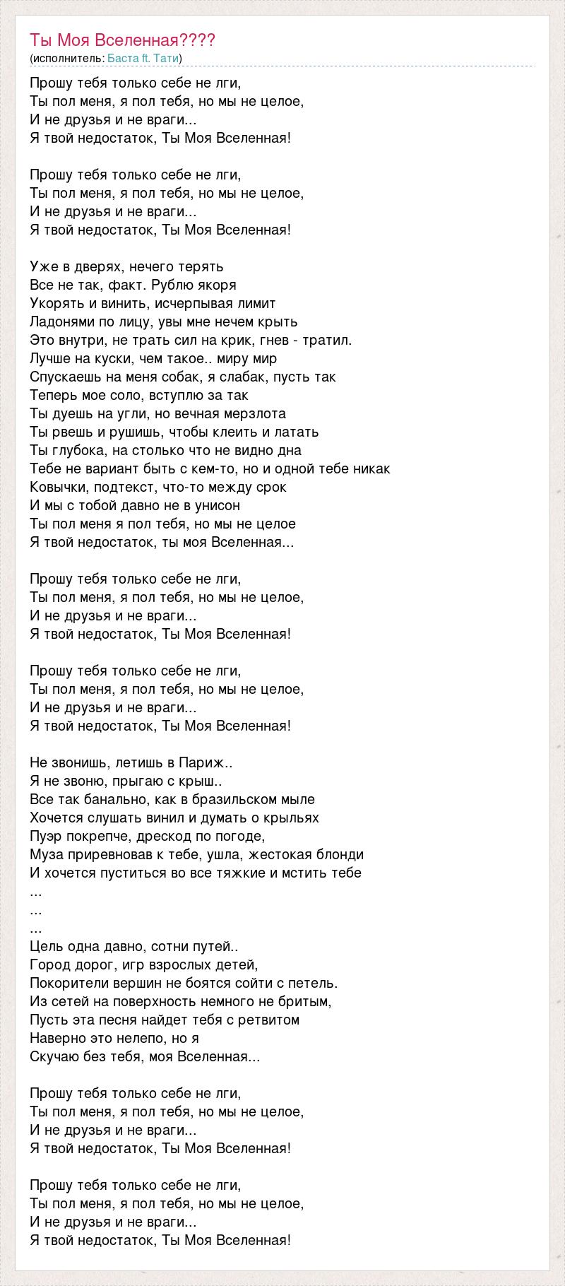 Прошу тебя только себе не лги, Ты пол меня, я пол тебя, но мы не целое, И не друзья и не враги... Я твой недостаток, Ты Моя Вселенная! Прошу тебя только себе не лги, Ты пол меня, я пол тебя, но мы не целое, И не друзья и не враги... Я твой недостаток, Ты Моя Вселенная! Уже в дверях, нечего терять Все не так, факт. Рублю якоря Укорять и винить, исчерпывая лимит Ладонями по лицу, увы мне нечем крыть Это внутри, не трать сил на крик, гнев - тратил. Лучше на куски, чем такое.. миру мир Спускаешь на меня собак, я слабак, пусть так Теперь мое соло, вступлю за так Ты дуешь на угли, но вечная мерзлота Ты рвешь и рушишь, чтобы клеить и латать Ты глубока, на столько что не видно дна Тебе не вариант быть с кем-то, но и одной тебе никак Ковычки, подтекст, что-то между срок И мы с тобой давно не в унисон Ты пол меня я пол тебя, но мы не целое Я твой недостаток, ты моя Вселенная... Прошу тебя только себе не лги, Ты пол меня, я пол тебя, но мы не целое, И не друзья и не враги... Я твой недостаток, Ты Моя Вселенная! Прошу тебя только себе не лги, Ты пол меня, я пол тебя, но мы не целое, И не друзья и не враги... Я твой недостаток, Ты Моя Вселенная! Не звонишь, летишь в Париж.. Я не звоню, прыгаю с крыш.. Все так банально, как в бразильском мыле Хочется слушать винил и думать о крыльях Пуэр покрепче, дрескод по погоде, Муза приревновав к тебе, ушла, жестокая блонди И хочется пуститься во все тяжкие и мстить тебе ... ... ... Цель одна давно, сотни путей.. Город дорог, игр взрослых детей, Покорители вершин не боятся сойти с петель. Из сетей на поверхность немного не бритым, Пусть эта песня найдет тебя с ретвитом Наверно это нелепо, но я Скучаю без тебя, моя Вселенная... Прошу тебя только себе не лги, Ты пол меня, я пол тебя, но мы не целое, И не друзья и не враги... Я твой недостаток, Ты Моя Вселенная! Прошу тебя только себе не лги, Ты пол меня, я пол тебя, но мы не целое, И не друзья и не враги... Я твой недостаток, Ты Моя Вселенная!