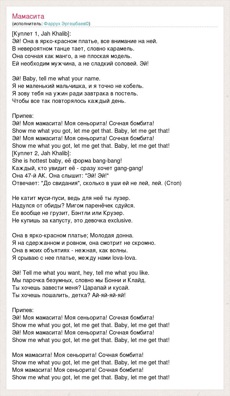 [Куплет 1, Jah Khalib]: Эй! Она в ярко-красном платье, все внимание на ней. В невероятном танце тает, словно карамель. Она сочная как манго, а не плоская модель. Ей необходим мужчина, а не сладкий соловей. Эй! Эй! Baby, tell me what your name. Я не маленький мальчишка, и я точно не кобель. Я зову тебя на ужин ради завтрака в постель. Чтобы все так повторялось каждый день. Припев: Эй! Моя мамасита! Моя сеньорита! Сочная бомбита! Show me what you got, let me get that. Baby, let me get that! Эй! Моя мамасита! Моя сеньорита! Сочная бомбита! Show me what you got, let me get that. Baby, let me get that! [Куплет 2, Jah Khalib]: She is hottest baby, её форма bang-bang! Каждый, кто увидит её - сразу хочет gang-gang! Она 47-й АК. Она слышит: "Эй! Эй!" Отвечает: "До свидания", сколько в уши ей не лей, лей. (Стоп) Не катит муси-пуси, ведь для неё ты лузер. Надулся от обиды? Мигом паренёчек сдуйся. Ее вообще не грузит, Бэнтли или Крузер. Не купишь за капусту, это девочка exclusive. Она в ярко-красном платье; Молодая донна. Я на сдержанном и ровном, она смотрит не скромно. Она в моих объятиях - нежная, как волны. Я срываю с нее платье, между нами lova-lova. Эй! Tell me what you want, hey, tell me what you like. Мы парочка безумных, словно мы Бонни и Клайд. Ты хочешь завести меня? Царапай и кусай. Ты хочешь пошалить, детка? Ай-яй-яй-яй! Припев: Эй! Моя мамасита! Моя сеньорита! Сочная бомбита! Show me what you got, let me get that. Baby, let me get that! Эй! Моя мамасита! Моя сеньорита! Сочная бомбита! Show me what you got, let me get that. Baby, let me get that! Моя мамасита! Моя сеньорита! Сочная бомбита! Show me what you got, let me get that. Baby, let me get that! Моя мамасита! Моя сеньорита! Сочная бомбита! Show me what you got, let me get that. Baby, let me get that!