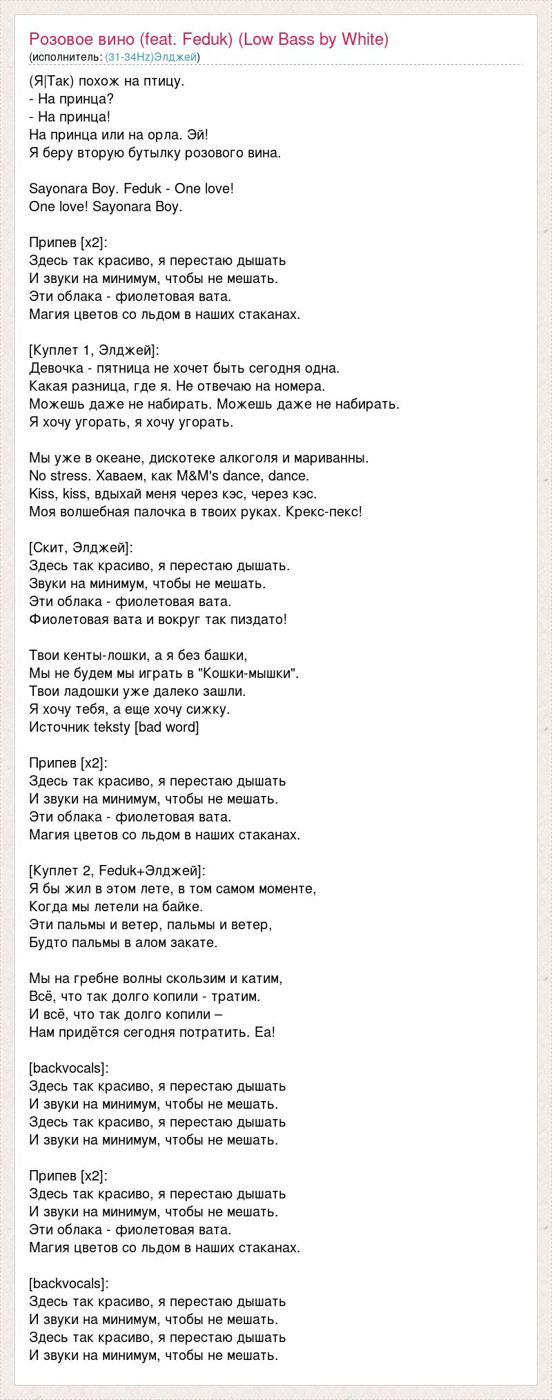 (Я|Так) похож на птицу. - На принца? - На принца! На принца или на орла. Эй! Я беру вторую бутылку розового вина. Sayonara Boy. Feduk - One love! One love! Sayonara Boy. Припев [x2]: Здесь так красиво, я перестаю дышать И звуки на минимум, чтобы не мешать. Эти облака - фиолетовая вата. Магия цветов со льдом в наших стаканах. [Куплет 1, Элджей]: Девочка - пятница не хочет быть сегодня одна. Какая разница, где я. Не отвечаю на номера. Можешь даже не набирать. Можешь даже не набирать. Я хочу угорать, я хочу угорать. Мы уже в океане, дискотеке алкоголя и мариванны. No stress. Хаваем, как M&M's dance, dance. Kiss, kiss, вдыхай меня через кэс, через кэс. Моя волшебная палочка в твоих руках. Крекс-пекс! [Скит, Элджей]: Здесь так красиво, я перестаю дышать. Звуки на минимум, чтобы не мешать. Эти облака - фиолетовая вата. Фиолетовая вата и вокруг так пиздато! Твои кенты-лошки, а я без башки, Мы не будем мы играть в "Кошки-мышки". Твои ладошки уже далеко зашли. Я хочу тебя, а еще хочу сижку. Источник teksty [bad word] Припев [x2]: Здесь так красиво, я перестаю дышать И звуки на минимум, чтобы не мешать. Эти облака - фиолетовая вата. Магия цветов со льдом в наших стаканах. [Куплет 2, Feduk+Элджей]: Я бы жил в этом лете, в том самом моменте, Когда мы летели на байке. Эти пальмы и ветер, пальмы и ветер, Будто пальмы в алом закате. Мы на гребне волны скользим и катим, Всё, что так долго копили - тратим. И всё, что так долго копили – Нам придётся сегодня потратить. Еа! [backvocals]: Здесь так красиво, я перестаю дышать И звуки на минимум, чтобы не мешать. Здесь так красиво, я перестаю дышать И звуки на минимум, чтобы не мешать. Припев [x2]: Здесь так красиво, я перестаю дышать И звуки на минимум, чтобы не мешать. Эти облака - фиолетовая вата. Магия цветов со льдом в наших стаканах. [backvocals]: Здесь так красиво, я перестаю дышать И звуки на минимум, чтобы не мешать. Здесь так красиво, я перестаю дышать И звуки на минимум, чтобы не мешать.