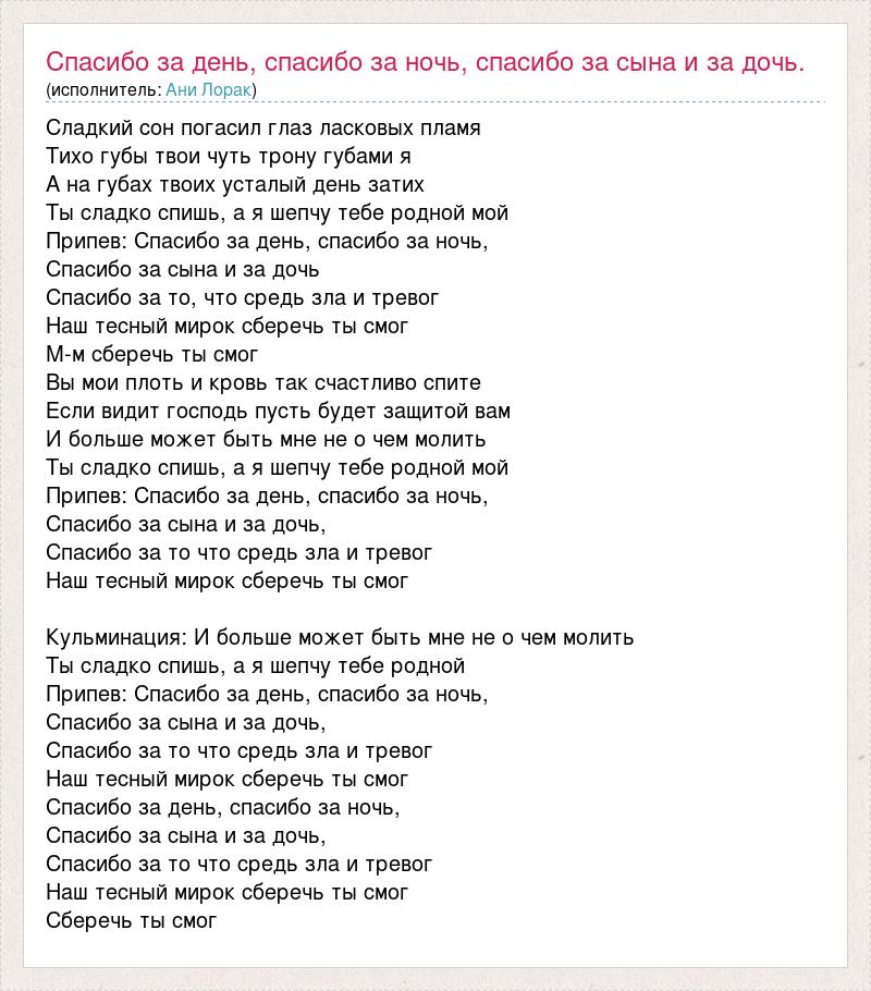 Сладкий сон погасил глаз ласковых пламя Тихо губы твои чуть трону губами я А на губах твоих усталый день затих Ты сладко спишь, а я шепчу тебе родной мой Припев: Спасибо за день, спасибо за ночь, Спасибо за сына и за дочь Спасибо за то, что средь зла и тревог Наш тесный мирок сберечь ты смог М-м сберечь ты смог Вы мои плоть и кровь так счастливо спите Если видит господь пусть будет защитой вам И больше может быть мне не о чем молить Ты сладко спишь, а я шепчу тебе родной мой Припев: Спасибо за день, спасибо за ночь, Спасибо за сына и за дочь, Спасибо за то что средь зла и тревог Наш тесный мирок сберечь ты смог Кульминация: И больше может быть мне не о чем молить Ты сладко спишь, а я шепчу тебе родной Припев: Спасибо за день, спасибо за ночь, Спасибо за сына и за дочь, Спасибо за то что средь зла и тревог Наш тесный мирок сберечь ты смог Спасибо за день, спасибо за ночь, Спасибо за сына и за дочь, Спасибо за то что средь зла и тревог Наш тесный мирок сберечь ты смог Сберечь ты смог