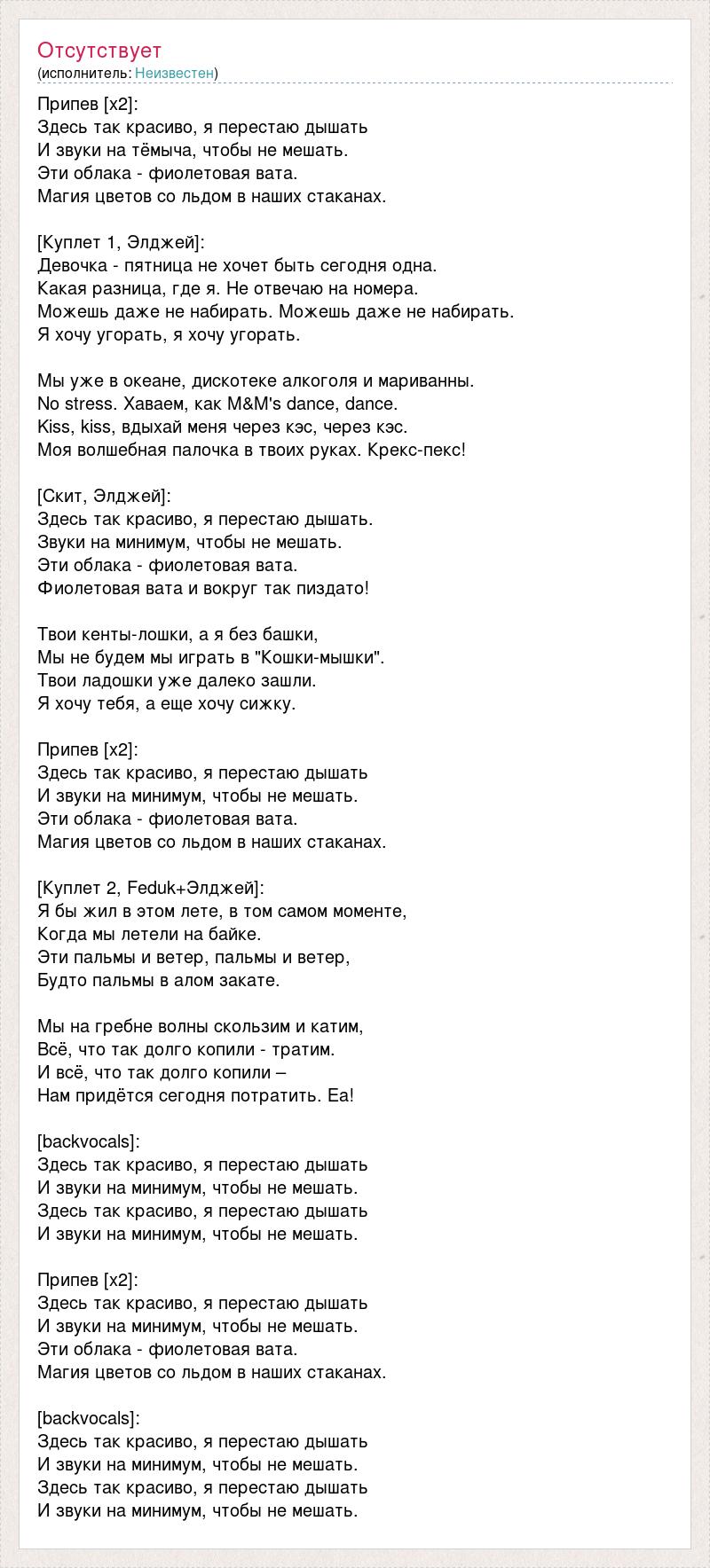Припев [x2]: Здесь так красиво, я перестаю дышать И звуки на тёмыча, чтобы не мешать. Эти облака - фиолетовая вата. Магия цветов со льдом в наших стаканах. [Куплет 1, Элджей]: Девочка - пятница не хочет быть сегодня одна. Какая разница, где я. Не отвечаю на номера. Можешь даже не набирать. Можешь даже не набирать. Я хочу угорать, я хочу угорать. Мы уже в океане, дискотеке алкоголя и мариванны. No stress. Хаваем, как M&M's dance, dance. Kiss, kiss, вдыхай меня через кэс, через кэс. Моя волшебная палочка в твоих руках. Крекс-пекс! [Скит, Элджей]: Здесь так красиво, я перестаю дышать. Звуки на минимум, чтобы не мешать. Эти облака - фиолетовая вата. Фиолетовая вата и вокруг так пиздато! Твои кенты-лошки, а я без башки, Мы не будем мы играть в "Кошки-мышки". Твои ладошки уже далеко зашли. Я хочу тебя, а еще хочу сижку. Припев [x2]: Здесь так красиво, я перестаю дышать И звуки на минимум, чтобы не мешать. Эти облака - фиолетовая вата. Магия цветов со льдом в наших стаканах. [Куплет 2, Feduk+Элджей]: Я бы жил в этом лете, в том самом моменте, Когда мы летели на байке. Эти пальмы и ветер, пальмы и ветер, Будто пальмы в алом закате. Мы на гребне волны скользим и катим, Всё, что так долго копили - тратим. И всё, что так долго копили – Нам придётся сегодня потратить. Еа! [backvocals]: Здесь так красиво, я перестаю дышать И звуки на минимум, чтобы не мешать. Здесь так красиво, я перестаю дышать И звуки на минимум, чтобы не мешать. Припев [x2]: Здесь так красиво, я перестаю дышать И звуки на минимум, чтобы не мешать. Эти облака - фиолетовая вата. Магия цветов со льдом в наших стаканах. [backvocals]: Здесь так красиво, я перестаю дышать И звуки на минимум, чтобы не мешать. Здесь так красиво, я перестаю дышать И звуки на минимум, чтобы не мешать.