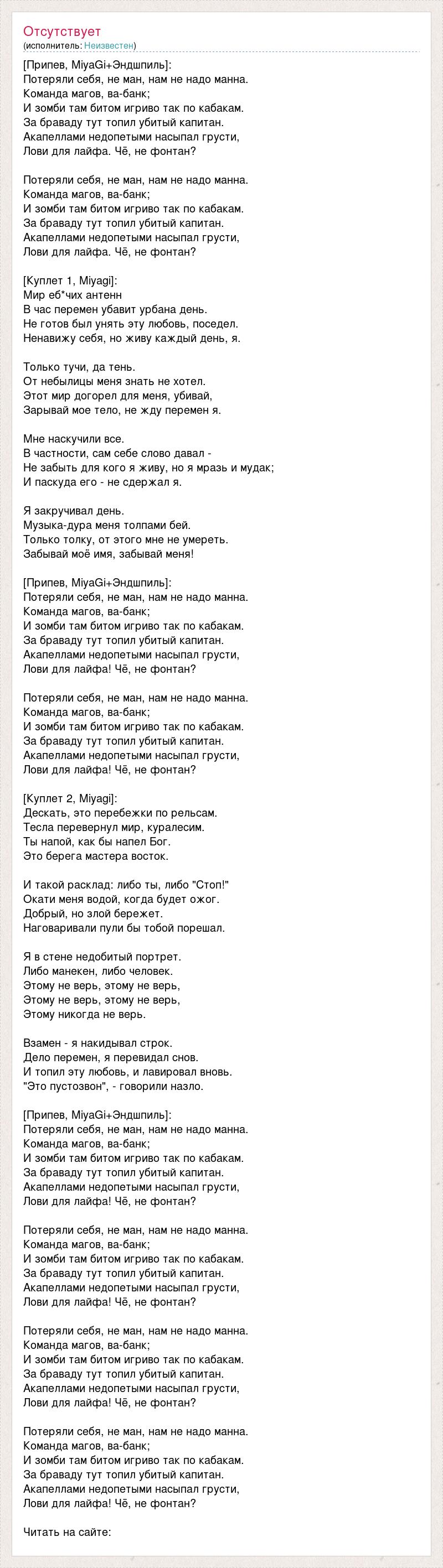 [Припев, MiyaGi+Эндшпиль]: Потеряли себя, не ман, нам не надо манна. Команда магов, ва-банк; И зомби там битом игриво так по кабакам. За браваду тут топил убитый капитан. Акапеллами недопетыми насыпал грусти, Лови для лайфа. Чё, не фонтан? Потеряли себя, не ман, нам не надо манна. Команда магов, ва-банк; И зомби там битом игриво так по кабакам. За браваду тут топил убитый капитан. Акапеллами недопетыми насыпал грусти, Лови для лайфа. Чё, не фонтан? [Куплет 1, Miyagi]: Мир еб*чих антенн В час перемен убавит урбана день. Не готов был унять эту любовь, поседел. Ненавижу себя, но живу каждый день, я. Только тучи, да тень. От небылицы меня знать не хотел. Этот мир догорел для меня, убивай, Зарывай мое тело, не жду перемен я. Мне наскучили все. В частности, сам себе слово давал - Не забыть для кого я живу, но я мразь и мудак; И паскуда его - не сдержал я. Я закручивал день. Музыка-дура меня толпами бей. Только толку, от этого мне не умереть. Забывай моё имя, забывай меня! [Припев, MiyaGi+Эндшпиль]: Потеряли себя, не ман, нам не надо манна. Команда магов, ва-банк; И зомби там битом игриво так по кабакам. За браваду тут топил убитый капитан. Акапеллами недопетыми насыпал грусти, Лови для лайфа! Чё, не фонтан? Потеряли себя, не ман, нам не надо манна. Команда магов, ва-банк; И зомби там битом игриво так по кабакам. За браваду тут топил убитый капитан. Акапеллами недопетыми насыпал грусти, Лови для лайфа! Чё, не фонтан? [Куплет 2, Miyagi]: Дескать, это перебежки по рельсам. Тесла перевернул мир, куралесим. Ты напой, как бы напел Бог. Это берега мастера восток. И такой расклад: либо ты, либо "Стоп!" Окати меня водой, когда будет ожог. Добрый, но злой бережет. Наговаривали пули бы тобой порешал. Я в стене недобитый портрет. Либо манекен, либо человек. Этому не верь, этому не верь, Этому не верь, этому не верь, Этому никогда не верь. Взамен - я накидывал строк. Дело перемен, я перевидал снов. И топил эту любовь, и лавировал вновь. "Это пустозвон", - говорили назло. [Припев, MiyaGi+Эндшпиль]: Потеряли себя, не ман, нам не надо манна. Команда магов, ва-банк; И зомби там битом игриво так по кабакам. За браваду тут топил убитый капитан. Акапеллами недопетыми насыпал грусти, Лови для лайфа! Чё, не фонтан? Потеряли себя, не ман, нам не надо манна. Команда магов, ва-банк; И зомби там битом игриво так по кабакам. За браваду тут топил убитый капитан. Акапеллами недопетыми насыпал грусти, Лови для лайфа! Чё, не фонтан? Потеряли себя, не ман, нам не надо манна. Команда магов, ва-банк; И зомби там битом игриво так по кабакам. За браваду тут топил убитый капитан. Акапеллами недопетыми насыпал грусти, Лови для лайфа! Чё, не фонтан? Потеряли себя, не ман, нам не надо манна. Команда магов, ва-банк; И зомби там битом игриво так по кабакам. За браваду тут топил убитый капитан. Акапеллами недопетыми насыпал грусти, Лови для лайфа! Чё, не фонтан? Читать на сайте: