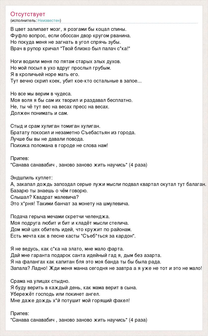 В цвет залипает мозг, я розгами бы коцал спины. Фуфло вопрос, если обоссан двор кругом рванина. Но покуда меня не загнать в угол спрячь зубы. Врач в рупор кричал "Твой близко был палач с*ка!" Ноги водили меня по пятам старых злых духов. Но мой посыл в ухо вдруг прослыл грубым. Я в кроличьей норе мать его. Тут вечно скрип коек, убит кое-кто остальные в запое... Но все мы верим в чудеса. Моя воля я бы сам их творил и раздавал бесплатно. Не, ты чё тут вес на весах пресс на весах. Должен понимать и сам. Стыд и срам хулиган томиган хулиган. Братату покосил и незаметно Съебастьян из города. Лучше бы вы не давали повода. Психика поломана в городе не слова нам! Припев: "Санава санавабич , заново заново жить научись" (4 раза) Эндшпиль куплет: А, закапал дождь запоздал серые лужи мысли подвал квартал окутал тут балаган. Базарю ты знаешь о чём говорю. Слышал? Квадрат малевича? Это х*рня! Такими банчат за монету на шмулевича. Подача герыча мечами скретчи челенджа. Моя подруга любит и бит и кладёт мысли стелича. Дом мой цех обитель идей, что кружит по районам. Есть мечта как в песне касты "Съеб*ться за кардон". Я не ведусь, как с*ка на злато, мне мало фарта. Дай мне гаранта подарок санта идейный гад я, дым без азарта. Я на фалангах как капитан бля это моя банда ты бы была рада. Запала? Ладно! Жди меня манна сегодня не завтра а я уже не тот и это не мало! Срама на улицах стыдно. Я буду верить в каждый день, как мама верит в сына. Убережёт господь или покинет ангел. Мне даже дождь х*й потушит мой горящий факел! Припев: "Санава санавабич , заново заново жить научись" (4 раза)
