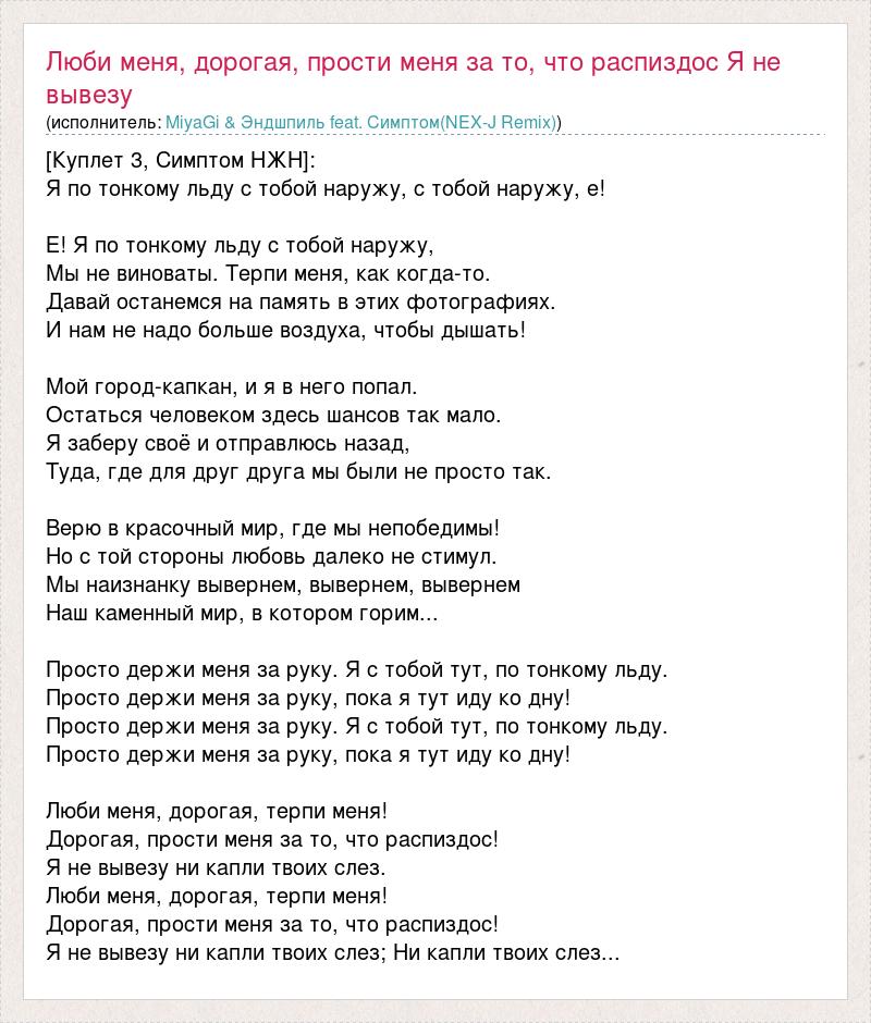 [Куплет 3, Симптом НЖН]: Я по тонкому льду с тобой наружу, с тобой наружу, е! Е! Я по тонкому льду с тобой наружу, Мы не виноваты. Терпи меня, как когда-то. Давай останемся на память в этих фотографиях. И нам не надо больше воздуха, чтобы дышать! Мой город-капкан, и я в него попал. Остаться человеком здесь шансов так мало. Я заберу своё и отправлюсь назад, Туда, где для друг друга мы были не просто так. Верю в красочный мир, где мы непобедимы! Но с той стороны любовь далеко не стимул. Мы наизнанку вывернем, вывернем, вывернем Наш каменный мир, в котором горим... Просто держи меня за руку. Я с тобой тут, по тонкому льду. Просто держи меня за руку, пока я тут иду ко дну! Просто держи меня за руку. Я с тобой тут, по тонкому льду. Просто держи меня за руку, пока я тут иду ко дну! Люби меня, дорогая, терпи меня! Дорогая, прости меня за то, что распиздос! Я не вывезу ни капли твоих слез. Люби меня, дорогая, терпи меня! Дорогая, прости меня за то, что распиздос! Я не вывезу ни капли твоих слез; Ни капли твоих слез...