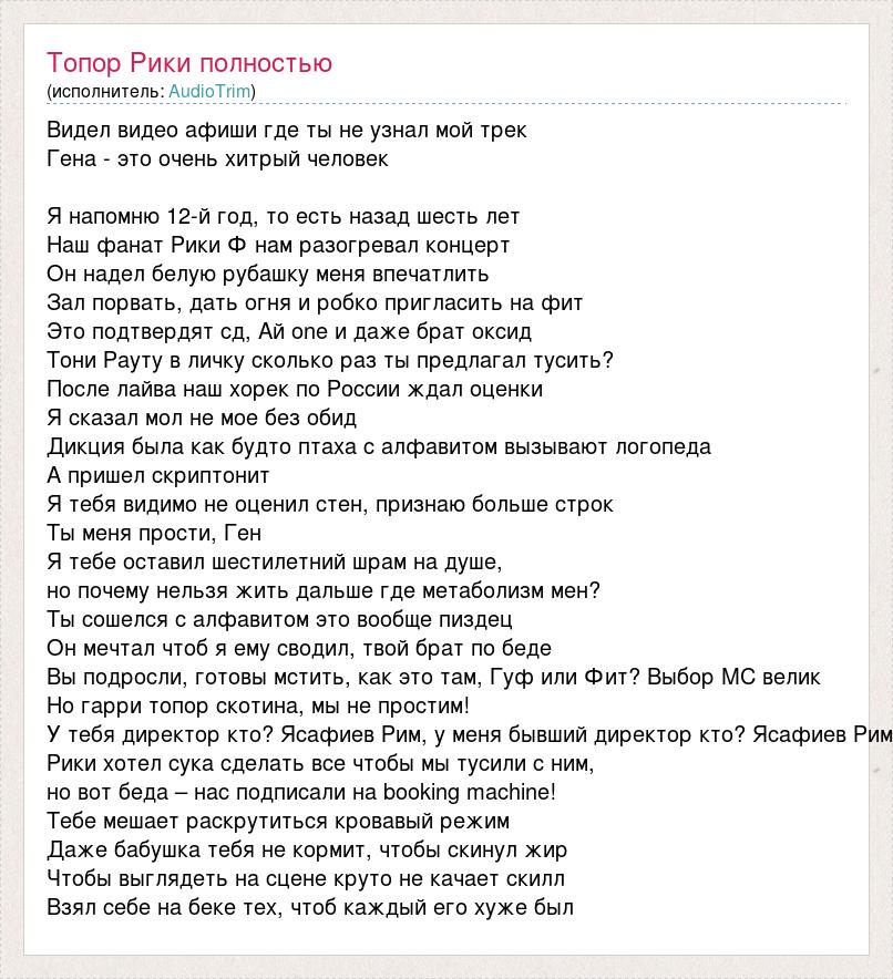 Видел видео афиши где ты не узнал мой трек Гена - это очень хитрый человек Я напомню 12-й год, то есть назад шесть лет Наш фанат Рики Ф нам разогревал концерт Он надел белую рубашку меня впечатлить Зал порвать, дать огня и робко пригласить на фит Это подтвердят сд, Ай one и даже брат оксид Тони Рауту в личку сколько раз ты предлагал тусить? После лайва наш хорек по России ждал оценки Я сказал мол не мое без обид Дикция была как будто птаха с алфавитом вызывают логопеда А пришел скриптонит Я тебя видимо не оценил стен, признаю больше строк Ты меня прости, Ген Я тебе оставил шестилетний шрам на душе, но почему нельзя жить дальше где метаболизм мен? Ты сошелся с алфавитом это вообще пиздец Он мечтал чтоб я ему сводил, твой брат по беде Вы подросли, готовы мстить, как это там, Гуф или Фит? Выбор МС велик Но гарри топор скотина, мы не простим! У тебя директор кто? Ясафиев Рим, у меня бывший директор кто? Ясафиев Рим Рики хотел сука сделать все чтобы мы тусили с ним, но вот беда – нас подписали на booking machine! Тебе мешает раскрутиться кровавый режим Даже бабушка тебя не кормит, чтобы скинул жир Чтобы выглядеть на сцене круто не качает скилл Взял себе на беке тех, чтоб каждый его хуже был