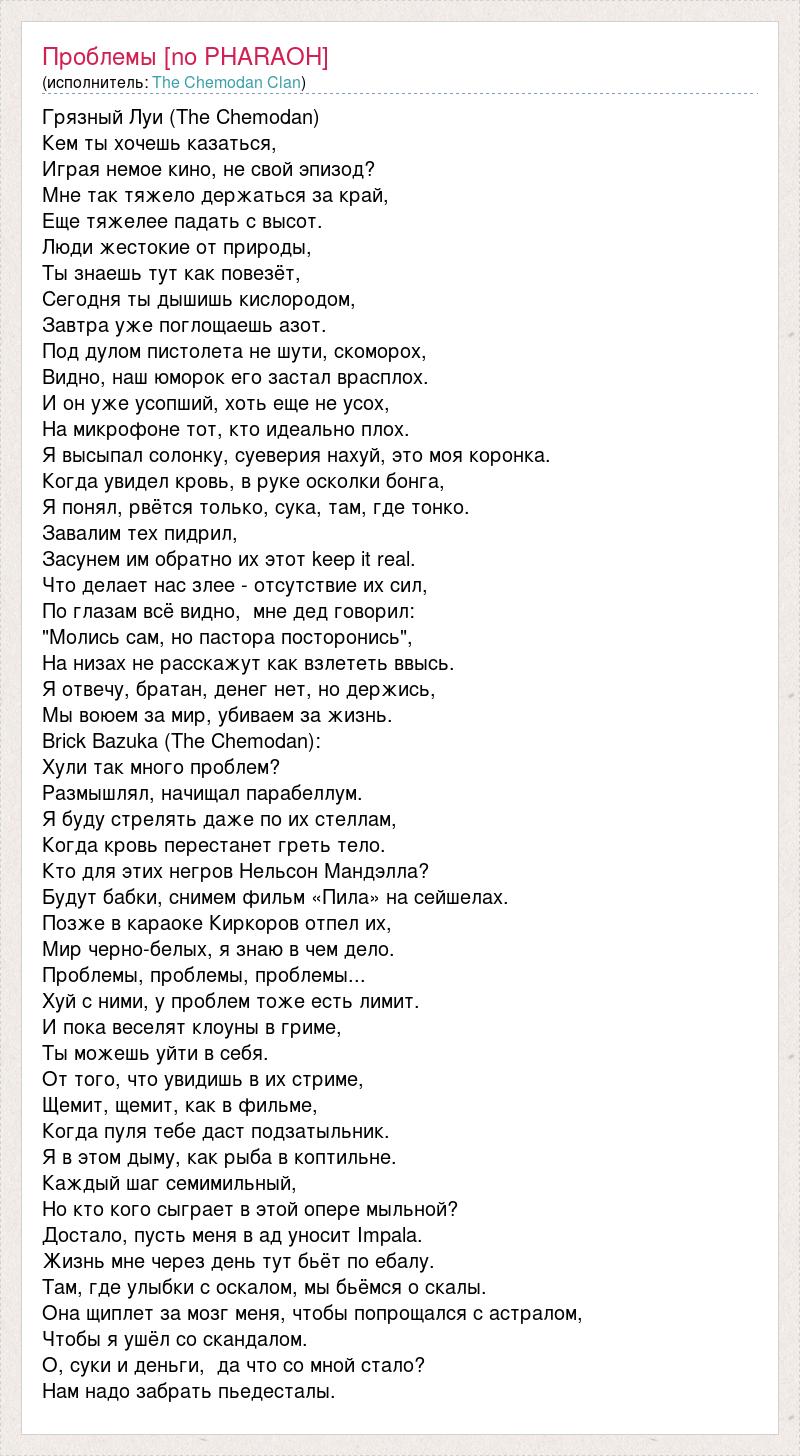 Грязный Луи (The Chemodan) Кем ты хочешь казаться, Играя немое кино, не свой эпизод? Мне так тяжело держаться за край, Еще тяжелее падать с высот. Люди жестокие от природы, Ты знаешь тут как повезёт, Сегодня ты дышишь кислородом, Завтра уже поглощаешь азот. Под дулом пистолета не шути, скоморох, Видно, наш юморок его застал врасплох. И он уже усопший, хоть еще не усох, На микрофоне тот, кто идеально плох. Я высыпал солонку, суеверия нахуй, это моя коронка. Когда увидел кровь, в руке осколки бонга, Я понял, рвётся только, сука, там, где тонко. Завалим тех пидрил, Засунем им обратно их этот keep it real. Что делает нас злее - отсутствие их сил, По глазам всё видно, мне дед говорил: "Молись сам, но пастора посторонись", На низах не расскажут как взлететь ввысь. Я отвечу, братан, денег нет, но держись, Мы воюем за мир, убиваем за жизнь. Brick Bazuka (The Chemodan): Хули так много проблем? Размышлял, начищал парабеллум. Я буду стрелять даже по их стеллам, Когда кровь перестанет греть тело. Кто для этих негров Нельсон Мандэлла? Будут бабки, снимем фильм «Пила» на сейшелах. Позже в караоке Киркоров отпел их, Мир черно-белых, я знаю в чем дело. Проблемы, проблемы, проблемы... Хуй с ними, у проблем тоже есть лимит. И пока веселят клоуны в гриме, Ты можешь уйти в себя. От того, что увидишь в их стриме, Щемит, щемит, как в фильме, Когда пуля тебе даст подзатыльник. Я в этом дыму, как рыба в коптильне. Каждый шаг семимильный, Но кто кого сыграет в этой опере мыльной? Достало, пусть меня в ад уносит Impala. Жизнь мне через день тут бьёт по ебалу. Там, где улыбки с оскалом, мы бьёмся о скалы. Она щиплет за мозг меня, чтобы попрощался с астралом, Чтобы я ушёл со скандалом. О, суки и деньги, да что со мной стало? Нам надо забрать пьедесталы.