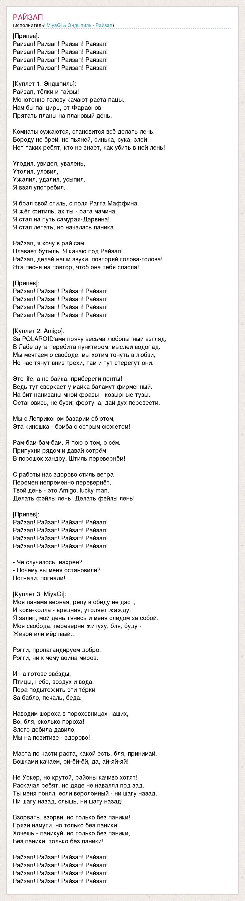 [Припев]: Райзап! Райзап! Райзап! Райзап! Райзап! Райзап! Райзап! Райзап! Райзап! Райзап! Райзап! Райзап! Райзап! Райзап! Райзап! Райзап! [Куплет 1, Эндшпиль]: Райзап, тёлки и гайзы! Монотонно голову качают раста пацы. Нам бы панцирь, от Фараонов - Прятать планы на плановый день. Комнаты сужаются, становится всё делать лень. Бороду не брей, не пьяней, синька, сука, злей! Нет таких ребят, кто не знает, как убить в ней лень! Угодил, увидел, увалень, Утолил, уловил, Ужалил, удалил, усыпил. Я взял употребил. Я брал свой стиль, с поля Рагга Маффина. Я жёг фитиль, ах ты - рага мамина, Я стал на путь самурая-Дарвина! Я стал летать, но началась паника. Райзап, я хочу в рай сам, Плавает бутыль. Я качаю под Райзап! Райзап, делай наши звуки, повторяй голова-голова! Эта песня на повтор, чтоб она тебя спасла! [Припев]: Райзап! Райзап! Райзап! Райзап! Райзап! Райзап! Райзап! Райзап! Райзап! Райзап! Райзап! Райзап! Райзап! Райзап! Райзап! Райзап! [Куплет 2, Amigo]: За POLAROID'ами прячу весьма любопытный взгляд, В Лабе дуга перебита пунктиром, мыслей водопад. Мы мечтаем о свободе, мы хотим тонуть в любви, Но нас тянут вниз грехи, там и тут стерегут они. Это life, а не байка, прибереги понты! Ведь тут сверкает у майка баламут фирменный. На бит нанизаны мной фразы - козырные тузы. Остановись, не бузи; фортуна, дай дух перевести. Мы с Леприконом базарим об этом, Эта киношка - бомба с острым сюжетом! Рам-бам-бам-бам. Я пою о том, о сём. Припухни рядом и давай сотрём В порошок хандру. Штиль перевернём! С работы нас здорово стиль ветра Перемен непременно перевернёт. Твой день - это Amigo, lucky man. Делать фэйлы лень! Делать фэйлы лень! [Припев]: Райзап! Райзап! Райзап! Райзап! Райзап! Райзап! Райзап! Райзап! Райзап! Райзап! Райзап! Райзап! Райзап! Райзап! Райзап! Райзап! - Чё случилось, нахрен? - Почему вы меня остановили? Погнали, погнали! [Куплет 3, MiyaGi]: Моя панама верная, репу в обиду не даст, И кока-колла - вредная, утоляет жажду. Я залип, мой день тянись и меня следом за собой. Моя свобода, переверни житуху, бля, буду - Живой или мёртвый... Рэгги, пропагандируем добро. Рэгги, ни к чему война миров. И на готове звёзды, Птицы, небо, воздух и вода. Пора подытожить эти тёрки За бабло, печаль, беда. Наводим шороха в пороховницах наших, Во, бля, сколько пороха! Злого дебила давило, Мы на позитиве - здорово! Маста по части раста, какой есть, бля, принимай. Бошками качаем, ой-ёй-ёй, да, ай-яй-яй! Не Уокер, но крутой, районы качиво хотят! Раскачал ребят, но дяде не навалял под зад. Ты меня понял, если вероломный - ни шагу назад, Ни шагу назад, слышь, ни шагу назад! Взорвать, взорви, но только без паники! Грязи намути, но только без паники! Хочешь - паникуй, но только без паники, Без паники, только без паники! Райзап! Райзап! Райзап! Райзап! Райзап! Райзап! Райзап! Райзап! Райзап! Райзап! Райзап! Райзап! Райзап! Райзап! Райзап! Райзап!