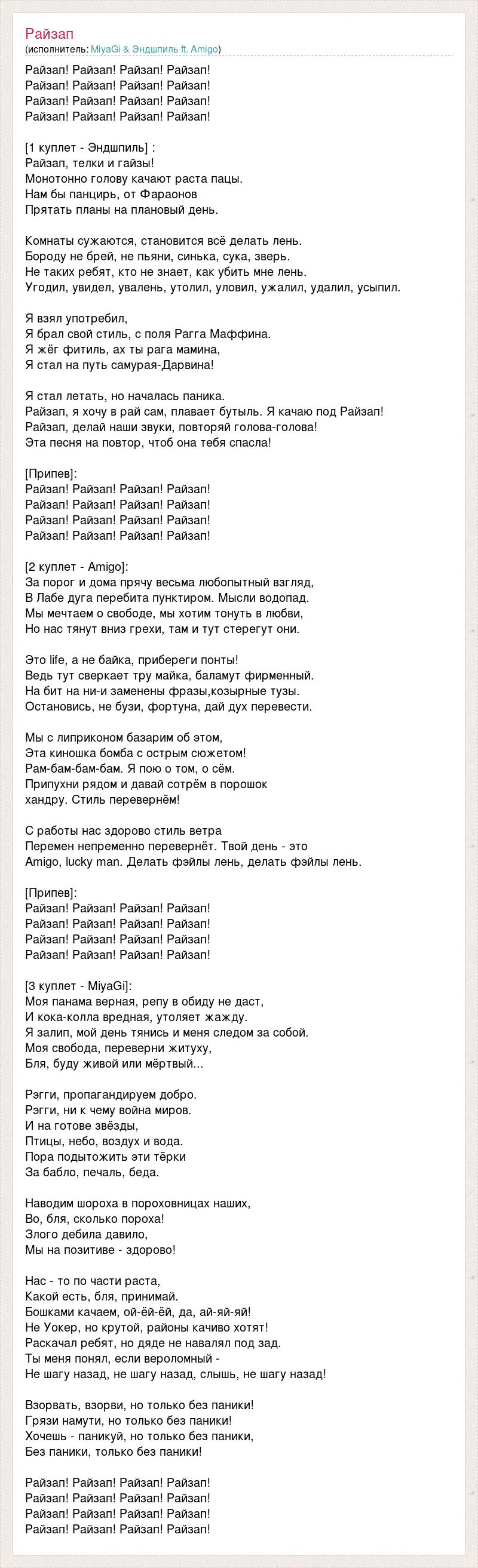 Райзап! Райзап! Райзап! Райзап! Райзап! Райзап! Райзап! Райзап! Райзап! Райзап! Райзап! Райзап! Райзап! Райзап! Райзап! Райзап! [1 куплет - Эндшпиль] : Райзап, телки и гайзы! Монотонно голову качают раста пацы. Нам бы панцирь, от Фараонов Прятать планы на плановый день. Комнаты сужаются, становится всё делать лень. Бороду не брей, не пьяни, синька, сука, зверь. Не таких ребят, кто не знает, как убить мне лень. Угодил, увидел, увалень, утолил, уловил, ужалил, удалил, усыпил. Я взял употребил, Я брал свой стиль, с поля Рагга Маффина. Я жёг фитиль, ах ты рага мамина, Я стал на путь самурая-Дарвина! Я стал летать, но началась паника. Райзап, я хочу в рай сам, плавает бутыль. Я качаю под Райзап! Райзап, делай наши звуки, повторяй голова-голова! Эта песня на повтор, чтоб она тебя спасла! [Припев]: Райзап! Райзап! Райзап! Райзап! Райзап! Райзап! Райзап! Райзап! Райзап! Райзап! Райзап! Райзап! Райзап! Райзап! Райзап! Райзап! [2 куплет - Amigo]: За порог и дома прячу весьма любопытный взгляд, В Лабе дуга перебита пунктиром. Мысли водопад. Мы мечтаем о свободе, мы хотим тонуть в любви, Но нас тянут вниз грехи, там и тут стерегут они. Это life, а не байка, прибереги понты! Ведь тут сверкает тру майка, баламут фирменный. На бит на ни-и заменены фразы,козырные тузы. Остановись, не бузи, фортуна, дай дух перевести. Мы с липриконом базарим об этом, Эта киношка бомба с острым сюжетом! Рам-бам-бам-бам. Я пою о том, о сём. Припухни рядом и давай сотрём в порошок хандру. Стиль перевернём! С работы нас здорово стиль ветра Перемен непременно перевернёт. Твой день - это Amigo, lucky man. Делать фэйлы лень, делать фэйлы лень. [Припев]: Райзап! Райзап! Райзап! Райзап! Райзап! Райзап! Райзап! Райзап! Райзап! Райзап! Райзап! Райзап! Райзап! Райзап! Райзап! Райзап! [3 куплет - MiyaGi]: Моя панама верная, репу в обиду не даст, И кока-колла вредная, утоляет жажду. Я залип, мой день тянись и меня следом за собой. Моя свобода, переверни житуху, Бля, буду живой или мёртвый... Рэгги, пропагандируем добро. Рэгги, ни к чему война миров. И на готове звёзды, Птицы, небо, воздух и вода. Пора подытожить эти тёрки За бабло, печаль, беда. Наводим шороха в пороховницах наших, Во, бля, сколько пороха! Злого дебила давило, Мы на позитиве - здорово! Нас - то по части раста, Какой есть, бля, принимай. Бошками качаем, ой-ёй-ёй, да, ай-яй-яй! Не Уокер, но крутой, районы качиво хотят! Раскачал ребят, но дяде не навалял под зад. Ты меня понял, если вероломный - Не шагу назад, не шагу назад, слышь, не шагу назад! Взорвать, взорви, но только без паники! Грязи намути, но только без паники! Хочешь - паникуй, но только без паники, Без паники, только без паники! Райзап! Райзап! Райзап! Райзап! Райзап! Райзап! Райзап! Райзап! Райзап! Райзап! Райзап! Райзап! Райзап! Райзап! Райзап! Райзап!