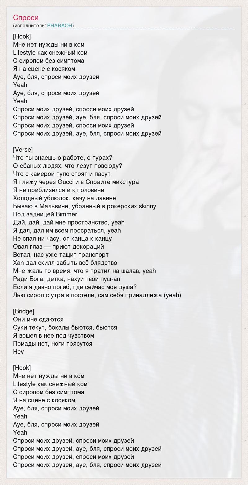 [Hook] Мне нет нужды ни в ком Lifestyle как снежный ком С сиропом без симптома Я на сцене с косяком Aye, бля, спроси моих друзей Yeah Aye, бля, спроси моих друзей Yeah Спроси моих друзей, спроси моих друзей Спроси моих друзей, aye, бля, спроси моих друзей Спроси моих друзей, спроси моих друзей Спроси моих друзей, aye, бля, спроси моих друзей [Verse] Что ты знаешь о работе, о турах? О ебаных людях, что лезут повсюду? Что с камерой тупо стоят и пасут Я гляжу через Gucci и в Спрайте микстура Я не приблизился и к половине Холодный ублюдок, качу на лавине Бываю в Мальвине, убранный в рокерских skinny Под задницей Bimmer Дай, дай, дай мне пространство, yeah Я дал, дал им всем просраться, yeah Не спал ни часу, от канца к канцу Овал глаз — приют декораций Встал, нас уже тащит транспорт Xan дал скилл забыть всё блядство Мне жаль то время, что я тратил на шалав, yeah Ради Бога, детка, нахуй твой пуш-ап Если я давно погиб, где сейчас моя душа? Лью сироп с утра в постели, сам себя принадлежа (yeah) [Bridge] Они мне сдаются Суки текут, бокалы бьются, бьются Я вошел в нее под чувством Помады нет, ноги трясутся Hey [Hook] Мне нет нужды ни в ком Lifestyle как снежный ком С сиропом без симптома Я на сцене с косяком Aye, бля, спроси моих друзей Yeah Aye, бля, спроси моих друзей Yeah Спроси моих друзей, спроси моих друзей Спроси моих друзей, aye, бля, спроси моих друзей Спроси моих друзей, спроси моих друзей Спроси моих друзей, aye, бля, спроси моих друзей