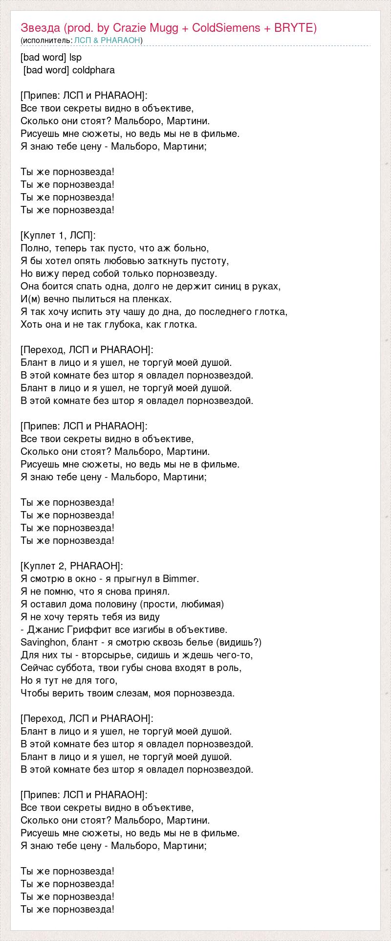 [bad word] lsp [bad word] coldphara [Припев: ЛСП и PHARAOH]: Все твои секреты видно в объективе, Сколько они стоят? Мальборо, Мартини. Рисуешь мне сюжеты, но ведь мы не в фильме. Я знаю тебе цену - Мальборо, Мартини; Ты же порнозвезда! Ты же порнозвезда! Ты же порнозвезда! Ты же порнозвезда! [Куплет 1, ЛСП]: Полно, теперь так пусто, что аж больно, Я бы хотел опять любовью заткнуть пустоту, Но вижу перед собой только порнозвезду. Она боится спать одна, долго не держит синиц в руках, И(м) вечно пылиться на пленках. Я так хочу испить эту чашу до дна, до последнего глотка, Хоть она и не так глубока, как глотка. [Переход, ЛСП и PHARAOH]: Блант в лицо и я ушел, не торгуй моей душой. В этой комнате без штор я овладел порнозвездой. Блант в лицо и я ушел, не торгуй моей душой. В этой комнате без штор я овладел порнозвездой. [Припев: ЛСП и PHARAOH]: Все твои секреты видно в объективе, Сколько они стоят? Мальборо, Мартини. Рисуешь мне сюжеты, но ведь мы не в фильме. Я знаю тебе цену - Мальборо, Мартини; Ты же порнозвезда! Ты же порнозвезда! Ты же порнозвезда! Ты же порнозвезда! [Куплет 2, PHARAOH]: Я смотрю в окно - я прыгнул в Bimmer. Я не помню, что я снова принял. Я оставил дома половину (прости, любимая) Я не хочу терять тебя из виду - Джанис Гриффит все изгибы в объективе. Savinghon, блант - я смотрю сквозь белье (видишь?) Для них ты - вторсырье, сидишь и ждешь чего-то, Сейчас суббота, твои губы снова входят в роль, Но я тут не для того, Чтобы верить твоим слезам, моя порнозвезда. [Переход, ЛСП и PHARAOH]: Блант в лицо и я ушел, не торгуй моей душой. В этой комнате без штор я овладел порнозвездой. Блант в лицо и я ушел, не торгуй моей душой. В этой комнате без штор я овладел порнозвездой. [Припев: ЛСП и PHARAOH]: Все твои секреты видно в объективе, Сколько они стоят? Мальборо, Мартини. Рисуешь мне сюжеты, но ведь мы не в фильме. Я знаю тебе цену - Мальборо, Мартини; Ты же порнозвезда! Ты же порнозвезда! Ты же порнозвезда! Ты же порнозвезда!