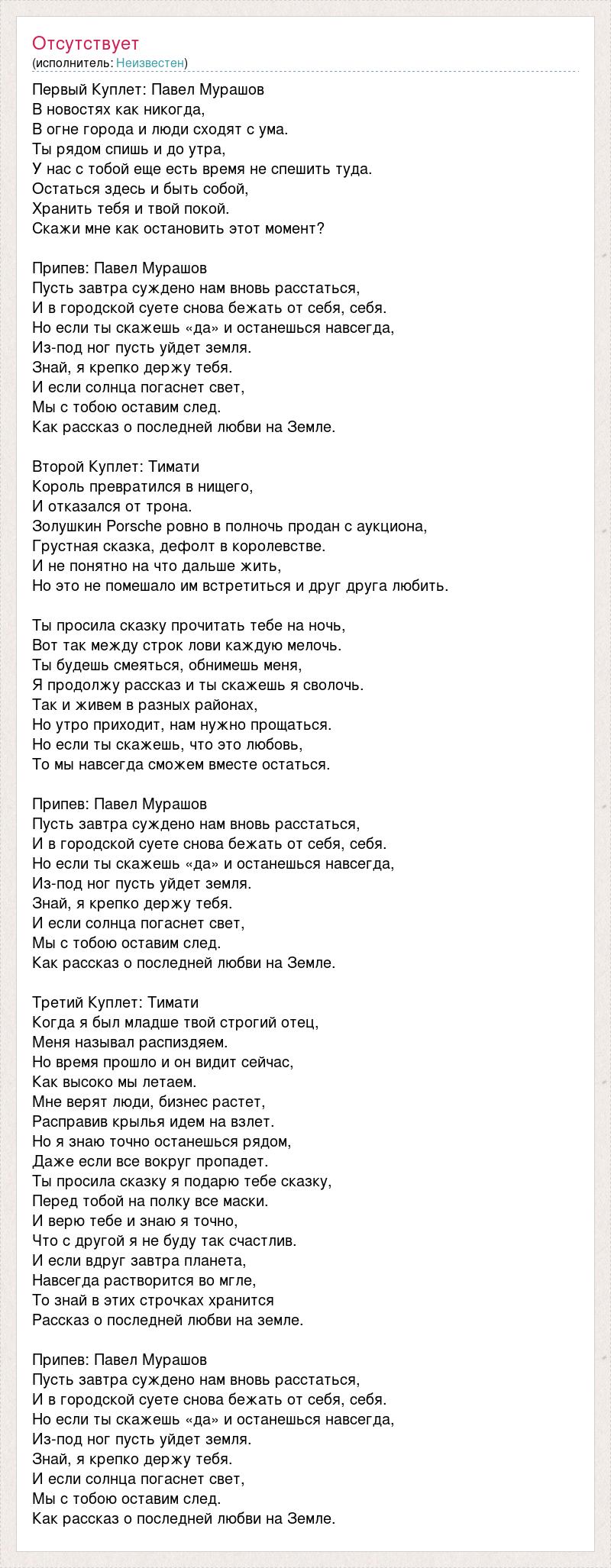Первый Куплет: Павел Мурашов В новостях как никогда, В огне города и люди сходят с ума. Ты рядом спишь и до утра, У нас с тобой еще есть время не спешить туда. Остаться здесь и быть собой, Хранить тебя и твой покой. Скажи мне как остановить этот момент? Припев: Павел Мурашов Пусть завтра суждено нам вновь расстаться, И в городской суете снова бежать от себя, себя. Но если ты скажешь «да» и останешься навсегда, Из-под ног пусть уйдет земля. Знай, я крепко держу тебя. И если солнца погаснет свет, Мы с тобою оставим след. Как рассказ о последней любви на Земле. Второй Куплет: Тимати Король превратился в нищего, И отказался от трона. Золушкин Porsche ровно в полночь продан с аукциона, Грустная сказка, дефолт в королевстве. И не понятно на что дальше жить, Но это не помешало им встретиться и друг друга любить. Ты просила сказку прочитать тебе на ночь, Вот так между строк лови каждую мелочь. Ты будешь смеяться, обнимешь меня, Я продолжу рассказ и ты скажешь я сволочь. Так и живем в разных районах, Но утро приходит, нам нужно прощаться. Но если ты скажешь, что это любовь, То мы навсегда сможем вместе остаться. Припев: Павел Мурашов Пусть завтра суждено нам вновь расстаться, И в городской суете снова бежать от себя, себя. Но если ты скажешь «да» и останешься навсегда, Из-под ног пусть уйдет земля. Знай, я крепко держу тебя. И если солнца погаснет свет, Мы с тобою оставим след. Как рассказ о последней любви на Земле. Третий Куплет: Тимати Когда я был младше твой строгий отец, Меня называл распиздяем. Но время прошло и он видит сейчас, Как высоко мы летаем. Мне верят люди, бизнес растет, Расправив крылья идем на взлет. Но я знаю точно останешься рядом, Даже если все вокруг пропадет. Ты просила сказку я подарю тебе сказку, Перед тобой на полку все маски. И верю тебе и знаю я точно, Что с другой я не буду так счастлив. И если вдруг завтра планета, Навсегда растворится во мгле, То знай в этих строчках хранится Рассказ о последней любви на земле. Припев: Павел Мурашов Пусть завтра суждено нам вновь расстаться, И в городской суете снова бежать от себя, себя. Но если ты скажешь «да» и останешься навсегда, Из-под ног пусть уйдет земля. Знай, я крепко держу тебя. И если солнца погаснет свет, Мы с тобою оставим след. Как рассказ о последней любви на Земле.
