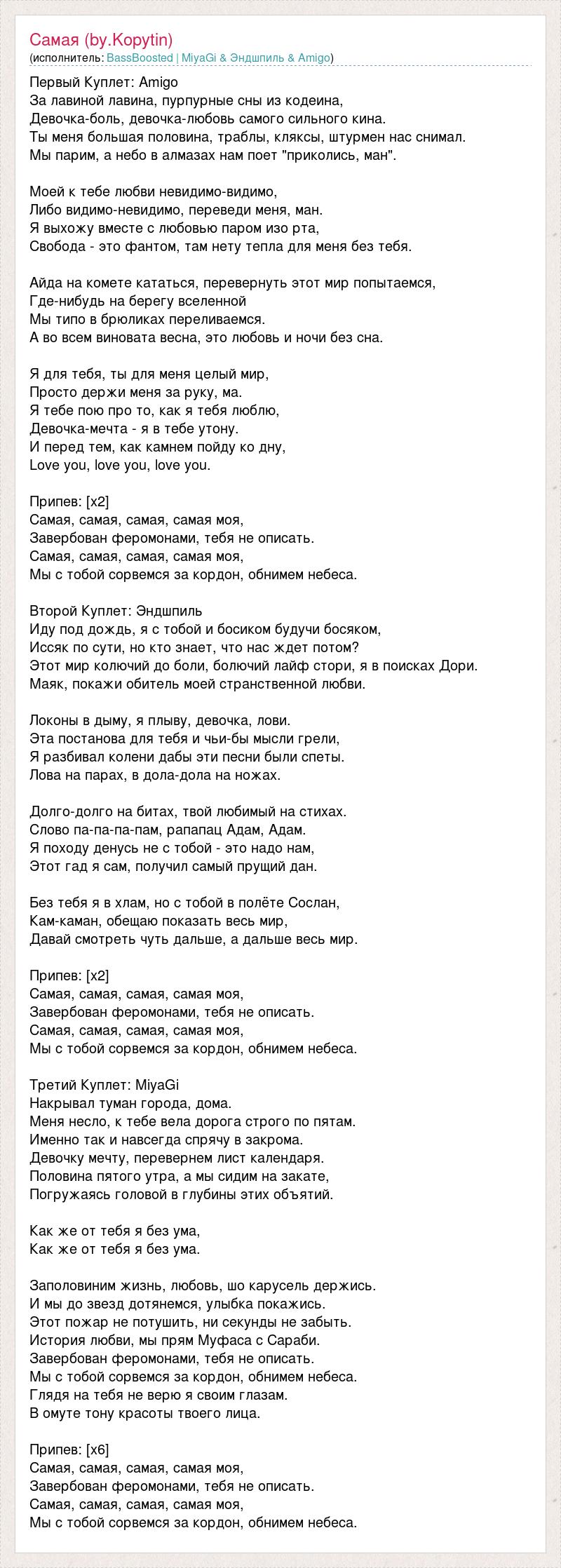 Первый Куплет: Amigo За лавиной лавина, пурпурные сны из кодеина, Девочка-боль, девочка-любовь самого сильного кина. Ты меня большая половина, траблы, кляксы, штурмен нас снимал. Мы парим, а небо в алмазах нам поет "приколись, ман". Моей к тебе любви невидимо-видимо, Либо видимо-невидимо, переведи меня, ман. Я выхожу вместе с любовью паром изо рта, Свобода - это фантом, там нету тепла для меня без тебя. Айда на комете кататься, перевернуть этот мир попытаемся, Где-нибудь на берегу вселенной Мы типо в брюликах переливаемся. А во всем виновата весна, это любовь и ночи без сна. Я для тебя, ты для меня целый мир, Просто держи меня за руку, ма. Я тебе пою про то, как я тебя люблю, Девочка-мечта - я в тебе утону. И перед тем, как камнем пойду ко дну, Love you, love you, love you. Припев: [х2] Самая, самая, самая, самая моя, Завербован феромонами, тебя не описать. Самая, самая, самая, самая моя, Мы с тобой сорвемся за кордон, обнимем небеса. Второй Куплет: Эндшпиль Иду под дождь, я с тобой и босиком будучи босяком, Иссяк по сути, но кто знает, что нас ждет потом? Этот мир колючий до боли, болючий лайф стори, я в поисках Дори. Маяк, покажи обитель моей странственной любви. Локоны в дыму, я плыву, девочка, лови. Эта постанова для тебя и чьи-бы мысли грели, Я разбивал колени дабы эти песни были спеты. Лова на парах, в дола-дола на ножах. Долго-долго на битах, твой любимый на стихах. Слово па-па-па-пам, рапапац Адам, Адам. Я походу денусь не с тобой - это надо нам, Этот гад я сам, получил самый прущий дан. Без тебя я в хлам, но с тобой в полёте Сослан, Кам-каман, обещаю показать весь мир, Давай смотреть чуть дальше, а дальше весь мир. Припев: [х2] Самая, самая, самая, самая моя, Завербован феромонами, тебя не описать. Самая, самая, самая, самая моя, Мы с тобой сорвемся за кордон, обнимем небеса. Третий Куплет: MiyaGi Накрывал туман города, дома. Меня несло, к тебе вела дорога строго по пятам. Именно так и навсегда спрячу в закрома. Девочку мечту, перевернем лист календаря. Половина пятого утра, а мы сидим на закате, Погружаясь головой в глубины этих объятий. Как же от тебя я без ума, Как же от тебя я без ума. Заполовиним жизнь, любовь, шо карусель держись. И мы до звезд дотянемся, улыбка покажись. Этот пожар не потушить, ни секунды не забыть. История любви, мы прям Муфаса с Сараби. Завербован феромонами, тебя не описать. Мы с тобой сорвемся за кордон, обнимем небеса. Глядя на тебя не верю я своим глазам. В омуте тону красоты твоего лица. Припев: [х6] Самая, самая, самая, самая моя, Завербован феромонами, тебя не описать. Самая, самая, самая, самая моя, Мы с тобой сорвемся за кордон, обнимем небеса.