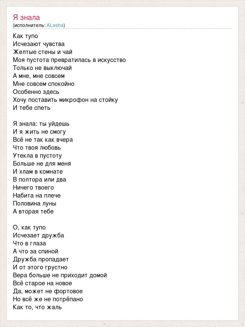 Как тупо Исчезают чувства Желтые стены и чай Моя пустота превратилась в искусство Только не выключай А мне, мне cовсем Мне совсем спокойно Особенно здесь Хочу поставить микрофон на стойку И тебе спеть Я знала: ты уйдешь И я жить не смогу Всё не так как вчера Что твоя любовь Утекла в пустоту Больше не для меня И хлам в комнате В полтора или два Ничего твоего Набита на плече Половина луны А вторая тебе О, как тупо Исчезает дружба Что в глаза А что за спиной Дружба пропадает И от этого грустно Вера больше не приходит домой Всё старое на новое Да, может не фортовое Но всё же не потрёпано Как то, что жаль