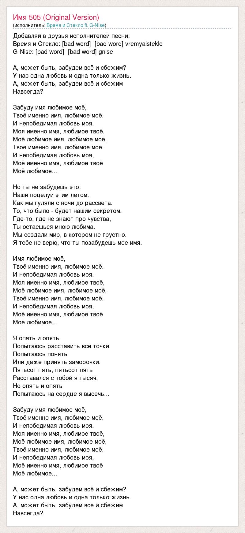 Добавляй в друзья исполнителей песни: Время и Стекло: [bad word] [bad word] vremyaisteklo G-Nise: [bad word] [bad word] gnise А, может быть, забудем всё и сбежим? У нас одна любовь и одна только жизнь. А, может быть, забудем всё и сбежим Навсегда? Забуду имя любимое моё, Твоё именно имя, любимое моё. И непобедимая любовь моя. Моя именно имя, любимое твоё, Моё любимое имя, любимое моё, Твоё именно имя, любимое моё. И непобедимая любовь моя, Моё именно имя, любимое твоё Моё любимое... Но ты не забудешь это: Наши поцелуи этим летом. Как мы гуляли с ночи до рассвета. То, что было - будет нашим секретом. Где-то, где не знают про чувства, Ты остаешься мною любима. Мы создали мир, в котором не грустно. Я тебе не верю, что ты позабудешь мое имя. Имя любимое моё, Твоё именно имя, любимое моё. И непобедимая любовь моя. Моя именно имя, любимое твоё, Моё любимое имя, любимое моё, Твоё именно имя, любимое моё. И непобедимая любовь моя, Моё именно имя, любимое твоё Моё любимое... Я опять и опять. Попытаюсь расставить все точки. Попытаюсь понять Или даже принять заморочки. Пятьсот пять, пятьсот пять Расставался с тобой я тысяч. Но опять и опять Попытаюсь на сердце я высечь... Забуду имя любимое моё, Твоё именно имя, любимое моё. И непобедимая любовь моя. Моя именно имя, любимое твоё, Моё любимое имя, любимое моё, Твоё именно имя, любимое моё. И непобедимая любовь моя, Моё именно имя, любимое твоё Моё любимое... А, может быть, забудем всё и сбежим? У нас одна любовь и одна только жизнь. А, может быть, забудем всё и сбежим Навсегда?