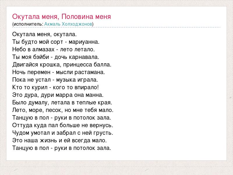 Окутала меня, окутала. Ты будто мой сорт - мариуанна. Небо в алмазах - лето летало. Ты моя бэйби - дочь карнавала. Двигайся крошка, принцесса балла. Ночь перемен - мысли растамана. Пока не устал - музыка играла. Кто то курил - кого то впирало! Это дура, дури марра она манна. Было думалу, летала в теплые края. Лето, море, песок, но мне тебя мало. Танцую в пол - руки в потолок зала. Оттуда куда пал больше не вернусь. Чудом умотал и забрал с ней грусть. Это наша жизнь и ей всегда мало. Танцую в пол - руки в потолок зала.