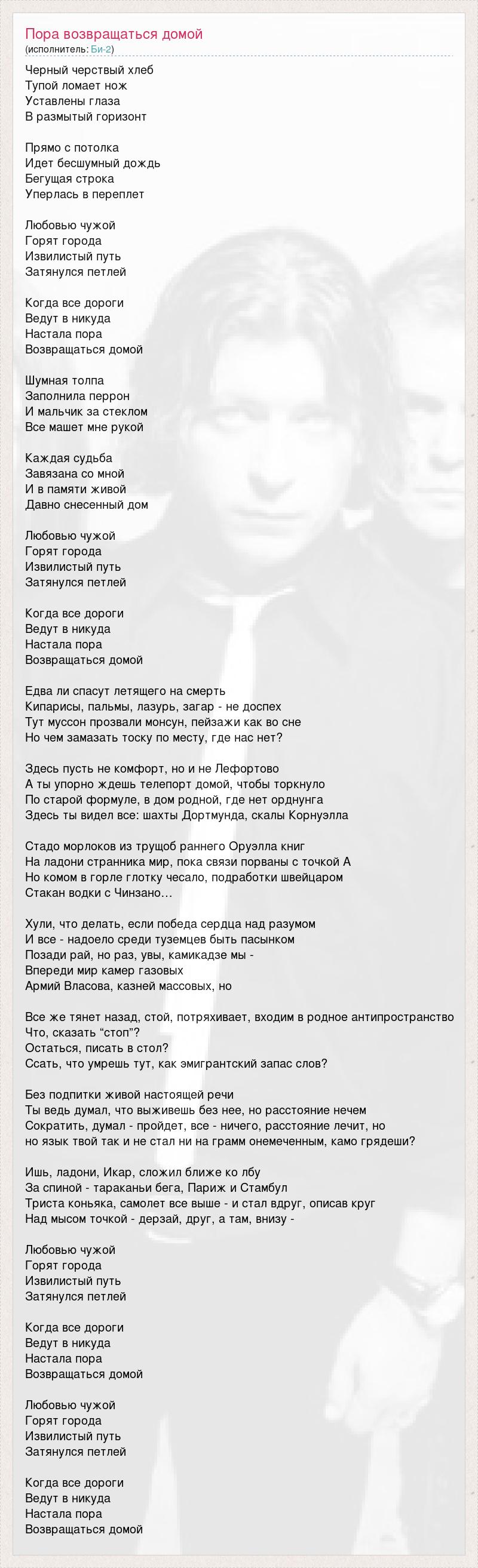 Черный черствый хлеб Тупой ломает нож Уставлены глаза В размытый горизонт Прямо с потолка Идет бесшумный дождь Бегущая строка Уперлась в переплет Любовью чужой Горят города Извилистый путь Затянулся петлей Когда все дороги Ведут в никуда Настала пора Возвращаться домой Шумная толпа Заполнила перрон И мальчик за стеклом Все машет мне рукой Каждая судьба Завязана со мной И в памяти живой Давно снесенный дом Любовью чужой Горят города Извилистый путь Затянулся петлей Когда все дороги Ведут в никуда Настала пора Возвращаться домой Едва ли спасут летящего на смерть Кипарисы, пальмы, лазурь, загар - не доспех Тут муссон прозвали монсун, пейзажи как во сне Но чем замазать тоску по месту, где нас нет? Здесь пусть не комфорт, но и не Лефортово А ты упорно ждешь телепорт домой, чтобы торкнуло По старой формуле, в дом родной, где нет орднунга Здесь ты видел все: шахты Дортмунда, скалы Корнуэлла Стадо морлоков из трущоб раннего Оруэлла книг На ладони странника мир, пока связи порваны с точкой А Но комом в горле глотку чесало, подработки швейцаром Стакан водки с Чинзано… Хули, что делать, если победа сердца над разумом И все - надоело среди туземцев быть пасынком Позади рай, но раз, увы, камикадзе мы - Впереди мир камер газовых Армий Власова, казней массовых, но Все же тянет назад, стой, потряхивает, входим в родное антипространство Что, сказать “стоп”? Остаться, писать в стол? Ссать, что умрешь тут, как эмигрантский запас слов? Без подпитки живой настоящей речи Ты ведь думал, что выживешь без нее, но расстояние нечем Сократить, думал - пройдет, все - ничего, расстояние лечит, но но язык твой так и не стал ни на грамм онемеченным, камо грядеши? Ишь, ладони, Икар, сложил ближе ко лбу За спиной - тараканьи бега, Париж и Стамбул Триста коньяка, самолет все выше - и стал вдруг, описав круг Над мысом точкой - дерзай, друг, а там, внизу - Любовью чужой Горят города Извилистый путь Затянулся петлей Когда все дороги Ведут в никуда Настала пора Возвращаться домой Любовью чужой Горят города Извилистый путь Затянулся петлей Когда все дороги Ведут в никуда Настала пора Возвращаться домой