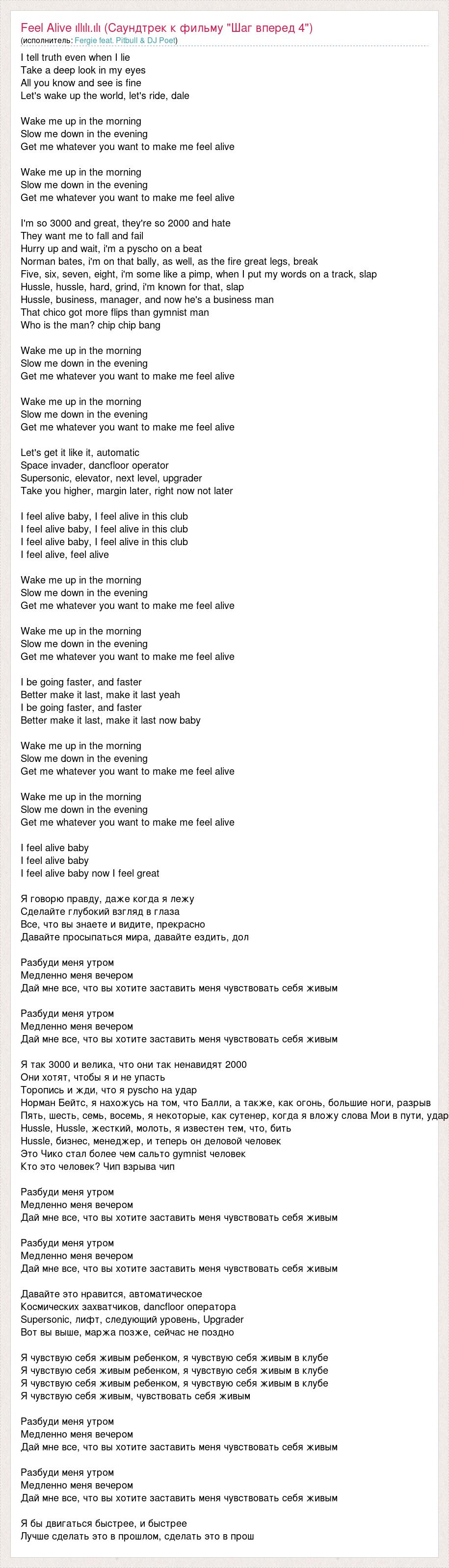 I tell truth even when I lie Take a deep look in my eyes All you know and see is fine Let's wake up the world, let's ride, dale Wake me up in the morning Slow me down in the evening Get me whatever you want to make me feel alive Wake me up in the morning Slow me down in the evening Get me whatever you want to make me feel alive I'm so 3000 and great, they're so 2000 and hate They want me to fall and fail Hurry up and wait, i'm a pyscho on a beat Norman bates, i'm on that bally, as well, as the fire great legs, break Five, six, seven, eight, i'm some like a pimp, when I put my words on a track, slap Hussle, hussle, hard, grind, i'm known for that, slap Hussle, business, manager, and now he's a business man That chico got more flips than gymnist man Who is the man? chip chip bang Wake me up in the morning Slow me down in the evening Get me whatever you want to make me feel alive Wake me up in the morning Slow me down in the evening Get me whatever you want to make me feel alive Let's get it like it, automatic Space invader, dancfloor operator Supersonic, elevator, next level, upgrader Take you higher, margin later, right now not later I feel alive baby, I feel alive in this club I feel alive baby, I feel alive in this club I feel alive baby, I feel alive in this club I feel alive, feel alive Wake me up in the morning Slow me down in the evening Get me whatever you want to make me feel alive Wake me up in the morning Slow me down in the evening Get me whatever you want to make me feel alive I be going faster, and faster Better make it last, make it last yeah I be going faster, and faster Better make it last, make it last now baby Wake me up in the morning Slow me down in the evening Get me whatever you want to make me feel alive Wake me up in the morning Slow me down in the evening Get me whatever you want to make me feel alive I feel alive baby I feel alive baby I feel alive baby now I feel great Я говорю правду, даже когда я лежу Сделайте глубокий взгляд в глаза Все, что вы знаете и видите, прекрасно Давайте просыпаться мира, давайте ездить, дол Разбуди меня утром Медленно меня вечером Дай мне все, что вы хотите заставить меня чувствовать себя живым Разбуди меня утром Медленно меня вечером Дай мне все, что вы хотите заставить меня чувствовать себя живым Я так 3000 и велика, что они так ненавидят 2000 Они хотят, чтобы я и не упасть Торопись и жди, что я pyscho на удар Норман Бейтс, я нахожусь на том, что Балли, а также, как огонь, большие ноги, разрыв Пять, шесть, семь, восемь, я некоторые, как сутенер, когда я вложу слова Мои в пути, удар Hussle, Hussle, жесткий, молоть, я известен тем, что, бить Hussle, бизнес, менеджер, и теперь он деловой человек Это Чико стал более чем сальто gymnist человек Кто это человек? Чип взрыва чип Разбуди меня утром Медленно меня вечером Дай мне все, что вы хотите заставить меня чувствовать себя живым Разбуди меня утром Медленно меня вечером Дай мне все, что вы хотите заставить меня чувствовать себя живым Давайте это нравится, автоматическое Космических захватчиков, dancfloor оператора Supersonic, лифт, следующий уровень, Upgrader Вот вы выше, маржа позже, сейчас не поздно Я чувствую себя живым ребенком, я чувствую себя живым в клубе Я чувствую себя живым ребенком, я чувствую себя живым в клубе Я чувствую себя живым ребенком, я чувствую себя живым в клубе Я чувствую себя живым, чувствовать себя живым Разбуди меня утром Медленно меня вечером Дай мне все, что вы хотите заставить меня чувствовать себя живым Разбуди меня утром Медленно меня вечером Дай мне все, что вы хотите заставить меня чувствовать себя живым Я бы двигаться быстрее, и быстрее Лучше сделать это в прошлом, сделать это в прош
