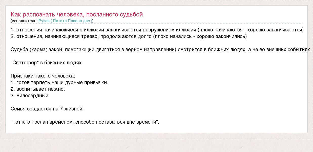 1. отношения начинающиеся с иллюзии заканчиваются разрушением иллюзии (плохо начинаются - хорошо заканчиваются) 2. отношения, начинающиеся трезво, продолжаются долго (плохо начались - хорошо закончились) Судьба (карма; закон, помогающий двигаться в верном направлении) смотрится в ближних людях, а не во внешних событиях. "Светофор" в ближних людях. Признаки такого человека: 1. готов терпеть наши дурные привычки. 2. воспитывает нежно. 3. милосердный Семья создается на 7 жизней. "Тот кто послан временем, способен оставаться вне времени".