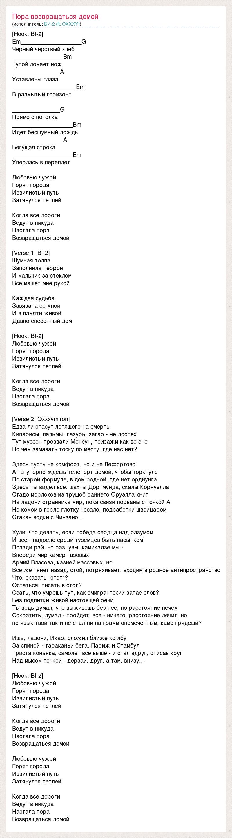 [Hook: BI-2] Em___________________G Черный черствый хлеб ________________Bm Тупой ломает нож _______________A Уставлены глаза ____________________Em В размытый горизонт _______________G Прямо с потолка ___________________Bm Идет бесшумный дождь ________________A Бегущая строка ___________________Em Уперлась в переплет Любовью чужой Горят города Извилистый путь Затянулся петлей Когда все дороги Ведут в никуда Настала пора Возвращаться домой [Verse 1: BI-2] Шумная толпа Заполнила перрон И мальчик за стеклом Все машет мне рукой Каждая судьба Завязана со мной И в памяти живой Давно снесенный дом [Hook: BI-2] Любовью чужой Горят города Извилистый путь Затянулся петлей Когда все дороги Ведут в никуда Настала пора Возвращаться домой [Verse 2: Oxxxymiron] Едва ли спасут летящего на смерть Кипарисы, пальмы, лазурь, загар - не доспех Тут муссон прозвали Монсун, пейзажи как во сне Но чем замазать тоску по месту, где нас нет? Здесь пусть не комфорт, но и не Лефортово А ты упорно ждешь телепорт домой, чтобы торкнуло По старой формуле, в дом родной, где нет орднунга Здесь ты видел все: шахты Дортмунда, скалы Корнуэлла Стадо морлоков из трущоб раннего Оруэлла книг На ладони странника мир, пока связи порваны с точкой А Но комом в горле глотку чесало, подработки швейцаром Стакан водки с Чинзано… Хули, что делать, если победа сердца над разумом И все - надоело среди туземцев быть пасынком Позади рай, но раз, увы, камикадзе мы - Впереди мир камер газовых Армий Власова, казней массовых, но Все же тянет назад, стой, потряхивает, входим в родное антипространство Что, сказать “стоп”? Остаться, писать в стол? Ссать, что умрешь тут, как эмигрантский запас слов? Без подпитки живой настоящей речи Ты ведь думал, что выживешь без нее, но расстояние нечем Сократить, думал - пройдет, все - ничего, расстояние лечит, но но язык твой так и не стал ни на грамм онемеченным, камо грядеши? Ишь, ладони, Икар, сложил ближе ко лбу За спиной - тараканьи бега, Париж и Стамбул Триста коньяка, самолет все выше - и стал вдруг, описав круг Над мысом точкой - дерзай, друг, а там, внизу.. - [Hook: BI-2] Любовью чужой Горят города Извилистый путь Затянулся петлей Когда все дороги Ведут в никуда Настала пора Возвращаться домой Любовью чужой Горят города Извилистый путь Затянулся петлей Когда все дороги Ведут в никуда Настала пора Возвращаться домой