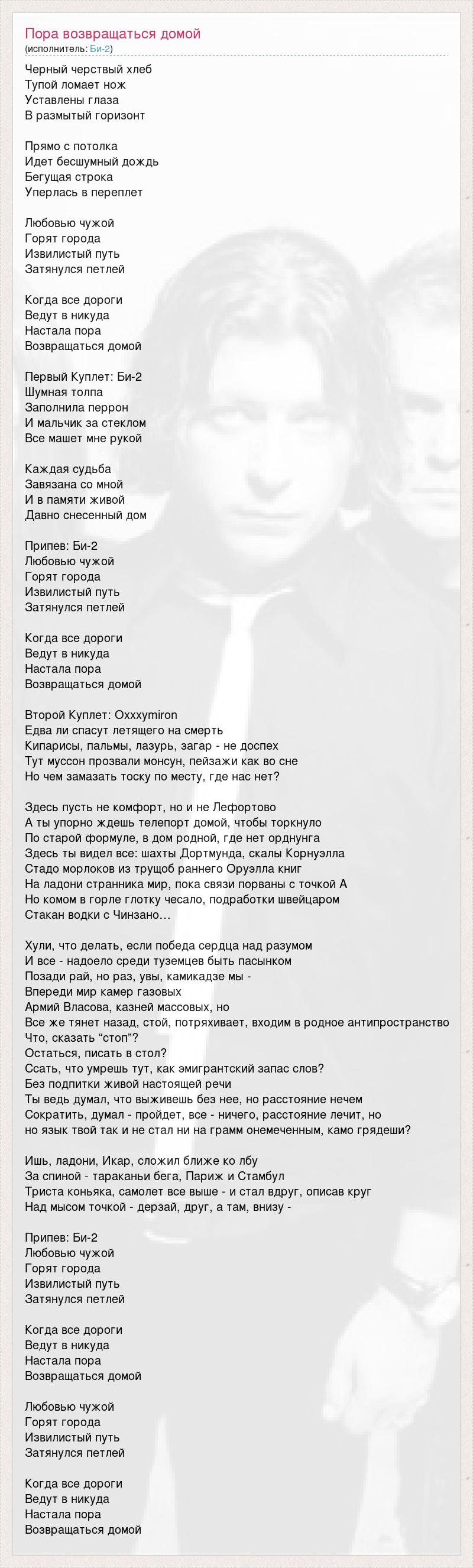 Черный черствый хлеб Тупой ломает нож Уставлены глаза В размытый горизонт Прямо с потолка Идет бесшумный дождь Бегущая строка Уперлась в переплет Любовью чужой Горят города Извилистый путь Затянулся петлей Когда все дороги Ведут в никуда Настала пора Возвращаться домой Первый Куплет: Би-2 Шумная толпа Заполнила перрон И мальчик за стеклом Все машет мне рукой Каждая судьба Завязана со мной И в памяти живой Давно снесенный дом Припев: Би-2 Любовью чужой Горят города Извилистый путь Затянулся петлей Когда все дороги Ведут в никуда Настала пора Возвращаться домой Второй Куплет: Oxxxymiron Едва ли спасут летящего на смерть Кипарисы, пальмы, лазурь, загар - не доспех Тут муссон прозвали монсун, пейзажи как во сне Но чем замазать тоску по месту, где нас нет? Здесь пусть не комфорт, но и не Лефортово А ты упорно ждешь телепорт домой, чтобы торкнуло По старой формуле, в дом родной, где нет орднунга Здесь ты видел все: шахты Дортмунда, скалы Корнуэлла Стадо морлоков из трущоб раннего Оруэлла книг На ладони странника мир, пока связи порваны с точкой А Но комом в горле глотку чесало, подработки швейцаром Стакан водки с Чинзано… Хули, что делать, если победа сердца над разумом И все - надоело среди туземцев быть пасынком Позади рай, но раз, увы, камикадзе мы - Впереди мир камер газовых Армий Власова, казней массовых, но Все же тянет назад, стой, потряхивает, входим в родное антипространство Что, сказать “стоп”? Остаться, писать в стол? Ссать, что умрешь тут, как эмигрантский запас слов? Без подпитки живой настоящей речи Ты ведь думал, что выживешь без нее, но расстояние нечем Сократить, думал - пройдет, все - ничего, расстояние лечит, но но язык твой так и не стал ни на грамм онемеченным, камо грядеши? Ишь, ладони, Икар, сложил ближе ко лбу За спиной - тараканьи бега, Париж и Стамбул Триста коньяка, самолет все выше - и стал вдруг, описав круг Над мысом точкой - дерзай, друг, а там, внизу - Припев: Би-2 Любовью чужой Горят города Извилистый путь Затянулся петлей Когда все дороги Ведут в никуда Настала пора Возвращаться домой Любовью чужой Горят города Извилистый путь Затянулся петлей Когда все дороги Ведут в никуда Настала пора Возвращаться домой