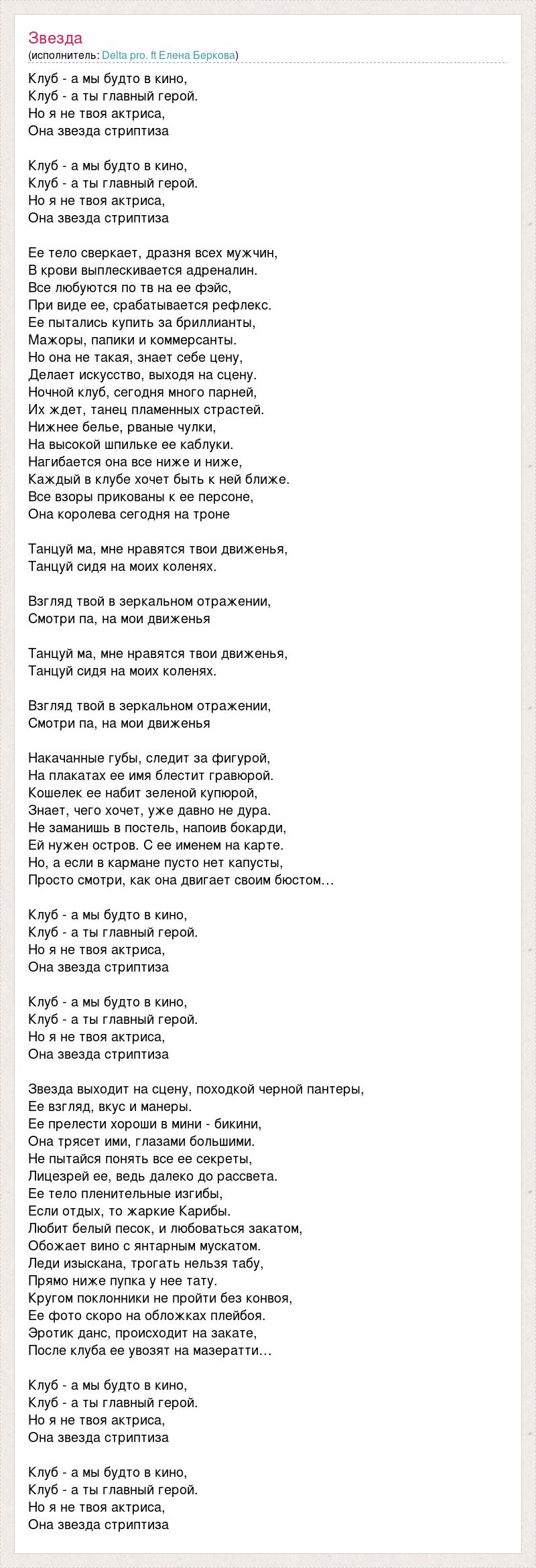 Клуб - а мы будто в кино, Клуб - а ты главный герой. Но я не твоя актриса, Она звезда стриптиза Клуб - а мы будто в кино, Клуб - а ты главный герой. Но я не твоя актриса, Она звезда стриптиза Ее тело сверкает, дразня всех мужчин, В крови выплескивается адреналин. Все любуются по тв на ее фэйс, При виде ее, срабатывается рефлекс. Ее пытались купить за бриллианты, Мажоры, папики и коммерсанты. Но она не такая, знает себе цену, Делает искусство, выходя на сцену. Ночной клуб, сегодня много парней, Их ждет, танец пламенных страстей. Нижнее белье, рваные чулки, На высокой шпильке ее каблуки. Нагибается она все ниже и ниже, Каждый в клубе хочет быть к ней ближе. Все взоры прикованы к ее персоне, Она королева сегодня на троне Танцуй ма, мне нравятся твои движенья, Танцуй сидя на моих коленях. Взгляд твой в зеркальном отражении, Смотри па, на мои движенья Танцуй ма, мне нравятся твои движенья, Танцуй сидя на моих коленях. Взгляд твой в зеркальном отражении, Смотри па, на мои движенья Накачанные губы, следит за фигурой, На плакатах ее имя блестит гравюрой. Кошелек ее набит зеленой купюрой, Знает, чего хочет, уже давно не дура. Не заманишь в постель, напоив бокарди, Ей нужен остров. С ее именем на карте. Но, а если в кармане пусто нет капусты, Просто смотри, как она двигает своим бюстом… Клуб - а мы будто в кино, Клуб - а ты главный герой. Но я не твоя актриса, Она звезда стриптиза Клуб - а мы будто в кино, Клуб - а ты главный герой. Но я не твоя актриса, Она звезда стриптиза Звезда выходит на сцену, походкой черной пантеры, Ее взгляд, вкус и манеры. Ее прелести хороши в мини - бикини, Она трясет ими, глазами большими. Не пытайся понять все ее секреты, Лицезрей ее, ведь далеко до рассвета. Ее тело пленительные изгибы, Если отдых, то жаркие Карибы. Любит белый песок, и любоваться закатом, Обожает вино с янтарным мускатом. Леди изыскана, трогать нельзя табу, Прямо ниже пупка у нее тату. Кругом поклонники не пройти без конвоя, Ее фото скоро на обложках плейбоя. Эротик данс, происходит на закате, После клуба ее увозят на мазератти… Клуб - а мы будто в кино, Клуб - а ты главный герой. Но я не твоя актриса, Она звезда стриптиза Клуб - а мы будто в кино, Клуб - а ты главный герой. Но я не твоя актриса, Она звезда стриптиза
