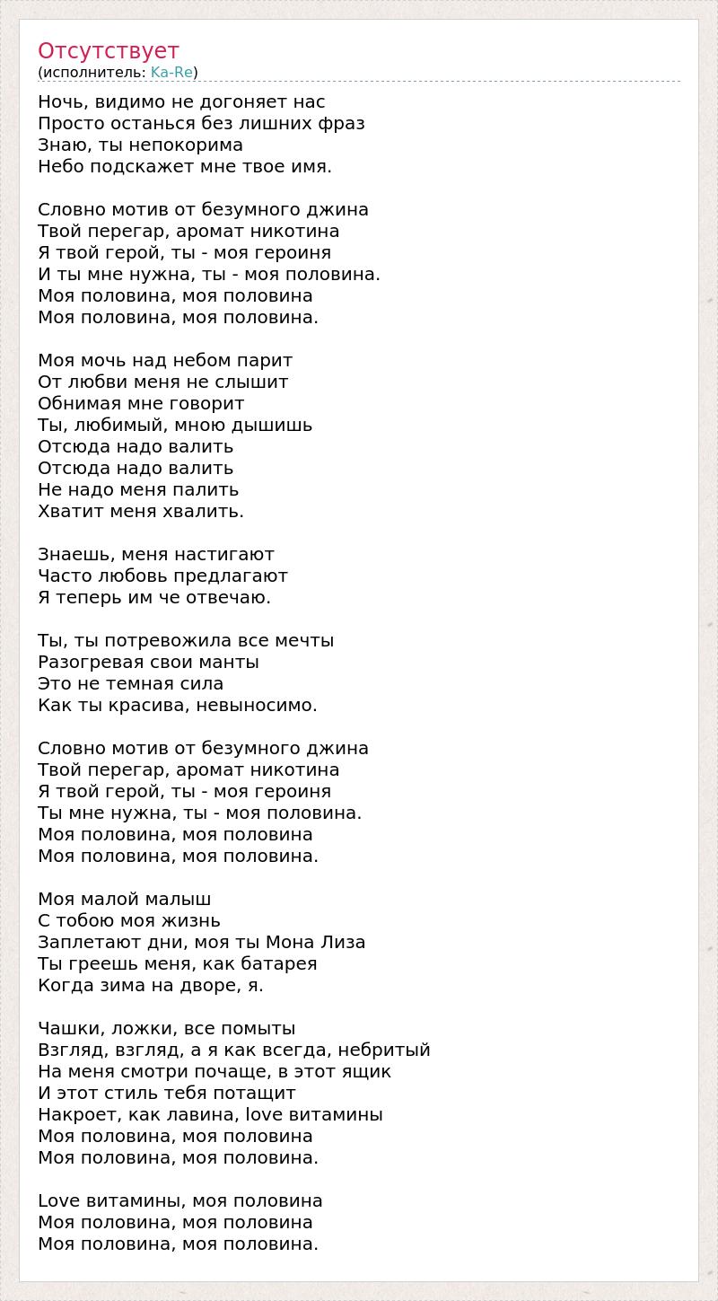 Ночь, видимо не догоняет нас Просто останься без лишних фраз Знаю, ты непокорима Небо подскажет мне твое имя. Словно мотив от безумного джина Твой перегар, аромат никотина Я твой герой, ты - моя героиня И ты мне нужна, ты - моя половина. Моя половина, моя половина Моя половина, моя половина. Моя мочь над небом парит От любви меня не слышит Обнимая мне говорит Ты, любимый, мною дышишь Отсюда надо валить Отсюда надо валить Не надо меня палить Хватит меня хвалить. Знаешь, меня настигают Часто любовь предлагают Я теперь им че отвечаю. Ты, ты потревожила все мечты Разогревая свои манты Это не темная сила Как ты красива, невыносимо. Словно мотив от безумного джина Твой перегар, аромат никотина Я твой герой, ты - моя героиня Ты мне нужна, ты - моя половина. Моя половина, моя половина Моя половина, моя половина. Моя малой малыш С тобою моя жизнь Заплетают дни, моя ты Мона Лиза Ты греешь меня, как батарея Когда зима на дворе, я. Чашки, ложки, все помыты Взгляд, взгляд, а я как всегда, небритый На меня смотри почаще, в этот ящик И этот стиль тебя потащит Накроет, как лавина, love витамины Моя половина, моя половина Моя половина, моя половина. Love витамины, моя половина Моя половина, моя половина Моя половина, моя половина.