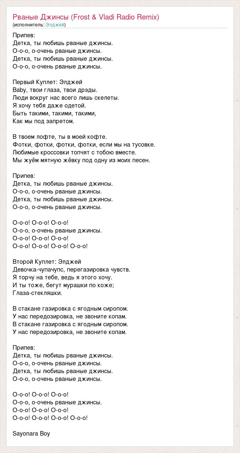 Припев: Детка, ты любишь рваные джинсы. О-о-о, о-очень рваные джинсы. Детка, ты любишь рваные джинсы. О-о-о, о-очень рваные джинсы. Первый Куплет: Элджей Baby, твои глаза, твои дрэды. Люди вокруг нас всего лишь скелеты. Я хочу тебя даже одетой. Быть такими, такими, такими, Как мы под запретом. В твоем лофте, ты в моей кофте. Фотки, фотки, фотки, фотки, если мы на тусовке. Любимые кроссовки топчят с тобою вместе. Мы жуём мятную жёвку под одну из моих песен. Припев: Детка, ты любишь рваные джинсы. О-о-о, о-очень рваные джинсы. Детка, ты любишь рваные джинсы. О-о-о, о-очень рваные джинсы. О-о-о! О-о-о! О-о-о! О-о-о, о-очень рваные джинсы. О-о-о! О-о-о! О-о-о! О-о-о! О-о-о! О-о-о! О-о-о! Второй Куплет: Элджей Девочка-чупачупс, перегазировка чувств. Я торчу на тебе, ведь я этого хочу. И ты тоже, бегут мурашки по коже; Глаза-стекляшки. В стакане газировка с ягодным сиропом. У нас передозировка, не звоните копам. В стакане газировка с ягодным сиропом. У нас передозировка, не звоните копам. Припев: Детка, ты любишь рваные джинсы. О-о-о, о-очень рваные джинсы. Детка, ты любишь рваные джинсы. О-о-о, о-очень рваные джинсы. О-о-о! О-о-о! О-о-о! О-о-о, о-очень рваные джинсы. О-о-о! О-о-о! О-о-о! О-о-о! О-о-о! О-о-о! О-о-о! Sayonara Boy