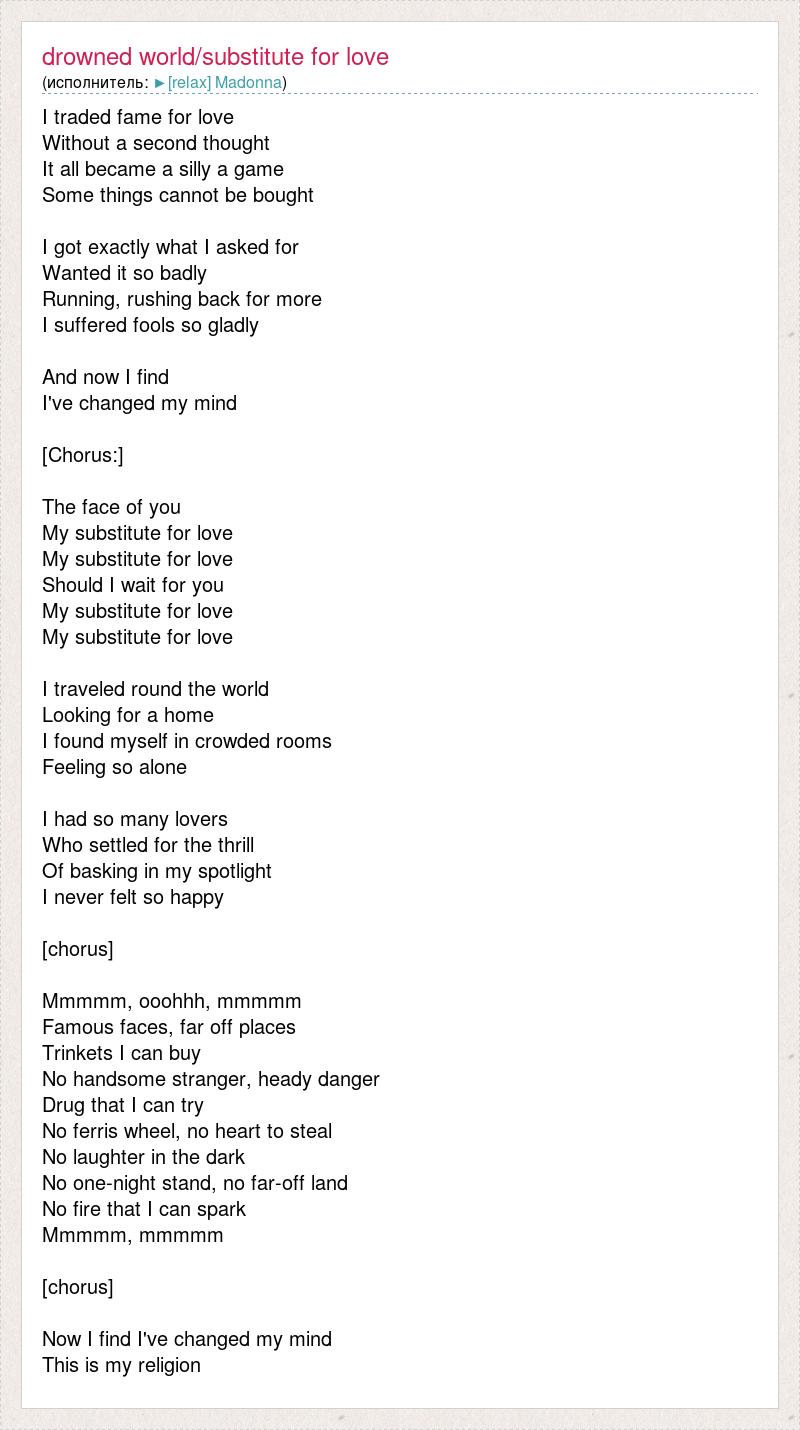 I traded fame for love Without a second thought It all became a silly a game Some things cannot be bought I got exactly what I asked for Wanted it so badly Running, rushing back for more I suffered fools so gladly And now I find I've changed my mind [Chorus:] The face of you My substitute for love My substitute for love Should I wait for you My substitute for love My substitute for love I traveled round the world Looking for a home I found myself in crowded rooms Feeling so alone I had so many lovers Who settled for the thrill Of basking in my spotlight I never felt so happy [chorus] Mmmmm, ooohhh, mmmmm Famous faces, far off places Trinkets I can buy No handsome stranger, heady danger Drug that I can try No ferris wheel, no heart to steal No laughter in the dark No one-night stand, no far-off land No fire that I can spark Mmmmm, mmmmm [chorus] Now I find I've changed my mind This is my religion