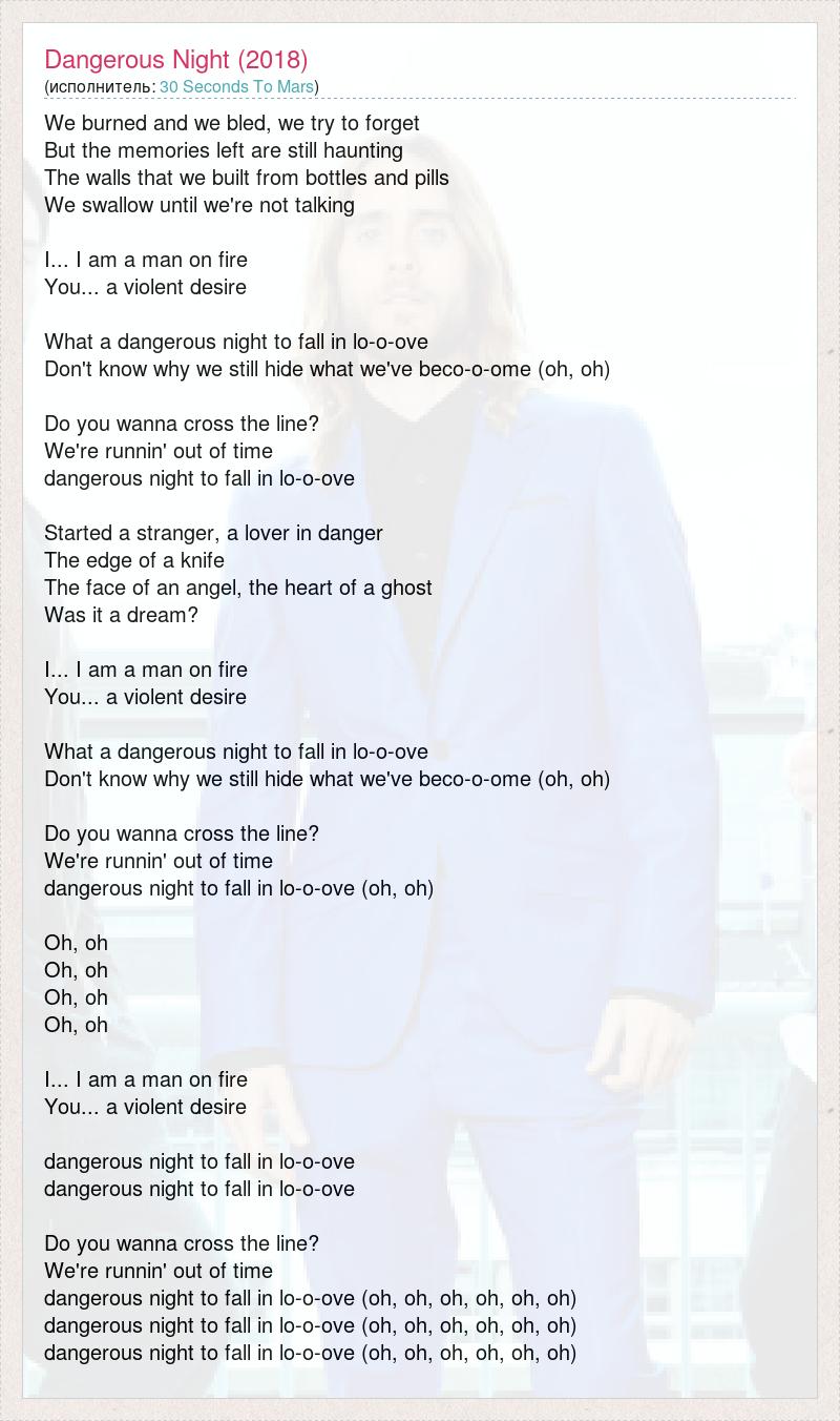 We burned and we bled, we try to forget But the memories left are still haunting The walls that we built from bottles and pills We swallow until we're not talking I... I am a man on fire You... a violent desire What a dangerous night to fall in lo-o-ove Don't know why we still hide what we've beco-o-ome (oh, oh) Do you wanna cross the line? We're runnin' out of time dangerous night to fall in lo-o-ove Started a stranger, a lover in danger The edge of a knife The face of an angel, the heart of a ghost Was it a dream? I... I am a man on fire You... a violent desire What a dangerous night to fall in lo-o-ove Don't know why we still hide what we've beco-o-ome (oh, oh) Do you wanna cross the line? We're runnin' out of time dangerous night to fall in lo-o-ove (oh, oh) Oh, oh Oh, oh Oh, oh Oh, oh I... I am a man on fire You... a violent desire dangerous night to fall in lo-o-ove dangerous night to fall in lo-o-ove Do you wanna cross the line? We're runnin' out of time dangerous night to fall in lo-o-ove (oh, oh, oh, oh, oh, oh) dangerous night to fall in lo-o-ove (oh, oh, oh, oh, oh, oh) dangerous night to fall in lo-o-ove (oh, oh, oh, oh, oh, oh)