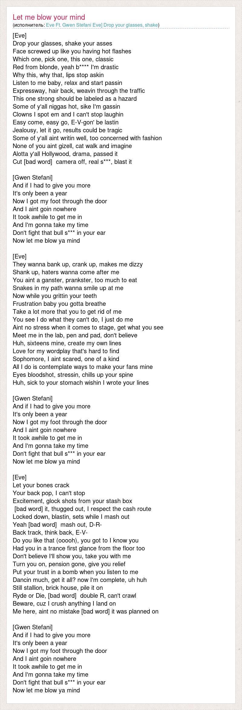 [Eve] Drop your glasses, shake your asses Face screwed up like you having hot flashes Which one, pick one, this one, classic Red from blonde, yeah b**** I'm drastic Why this, why that, lips stop askin Listen to me baby, relax and start passin Expressway, hair back, weavin through the traffic This one strong should be labeled as a hazard Some of y'all niggas hot, sike I'm gassin Clowns I spot em and I can't stop laughin Easy come, easy go, E-V-gon' be lastin Jealousy, let it go, results could be tragic Some of y'all aint writin well, too concerned with fashion None of you aint gizell, cat walk and imagine Alotta y'all Hollywood, drama, passed it Cut [bad word] camera off, real s***, blast it [Gwen Stefani] And if I had to give you more It's only been a year Now I got my foot through the door And I aint goin nowhere It took awhile to get me in And I'm gonna take my time Don't fight that bull s*** in your ear Now let me blow ya mind [Eve] They wanna bank up, crank up, makes me dizzy Shank up, haters wanna come after me You aint a ganster, prankster, too much to eat Snakes in my path wanna smile up at me Now while you grittin your teeth Frustration baby you gotta breathe Take a lot more that you to get rid of me You see I do what they can't do, I just do me Aint no stress when it comes to stage, get what you see Meet me in the lab, pen and pad, don't believe Huh, sixteens mine, create my own lines Love for my wordplay that's hard to find Sophomore, I aint scared, one of a kind All I do is contemplate ways to make your fans mine Eyes bloodshot, stressin, chills up your spine Huh, sick to your stomach wishin I wrote your lines [Gwen Stefani] And if I had to give you more It's only been a year Now I got my foot through the door And I aint goin nowhere It took awhile to get me in And I'm gonna take my time Don't fight that bull s*** in your ear Now let me blow ya mind [Eve] Let your bones crack Your back pop, I can't stop Excitement, glock shots from your stash box [bad word] it, thugged out, I respect the cash route Locked down, blastin, sets while I mash out Yeah [bad word] mash out, D-R- Back track, think back, E-V- Do you like that (ooooh), you got to I know you Had you in a trance first glance from the floor too Don't believe I'll show you, take you with me Turn you on, pension gone, give you relief Put your trust in a bomb when you listen to me Dancin much, get it all? now I'm complete, uh huh Still stallion, brick house, pile it on Ryde or Die, [bad word] double R, can't crawl Beware, cuz I crush anything I land on Me here, aint no mistake [bad word] it was planned on [Gwen Stefani] And if I had to give you more It's only been a year Now I got my foot through the door And I aint goin nowhere It took awhile to get me in And I'm gonna take my time Don't fight that bull s*** in your ear Now let me blow ya mind