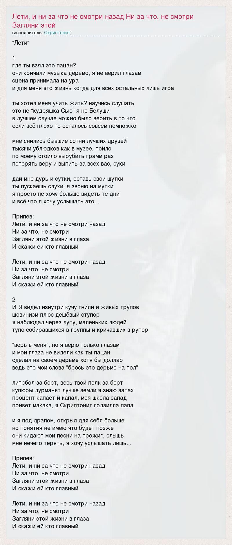"Лети" 1 где ты взял это пацан? они кричали музыка дерьмо, я не верил глазам сцена принимала на ура и для меня это жизнь когда для всех остальных лишь игра ты хотел меня учить жить? научись слушать это не "кудряшка Сью" я не Белуши в лучшем случае можно было верить в то что если всё плохо то осталось совсем немножко мне снились бывшие сотни лучших друзей тысячи ублюдков как в музее, пойло по моему стоило вырубить грамм раз потерять веру и выпить за всех вас, суки дай мне дурь и сутки, оставь свои шутки ты пускаешь слухи, я звоню на мутки я просто не хочу больше видеть те дни и всё что я хочу услышать это... Припев: Лети, и ни за что не смотри назад Ни за что, не смотри Загляни этой жизни в глаза И скажи ей кто главный Лети, и ни за что не смотри назад Ни за что, не смотри Загляни этой жизни в глаза И скажи ей кто главный 2 И Я видел изнутри кучу гнили и живых трупов шовинизм плюс дешёвый ступор я наблюдал через лупу, маленьких людей тупо собиравшихся в группы и кричавших в рупор "верь в меня", но я верю только глазам и мои глаза не видели как ты пацан сделал на своём дерьме хотя бы доллар ведь это мои слова "брось это дерьмо на пол" литрбол за борт, весь твой полк за борт купюры дурманят лучше земли я знаю запах процент капает и капал, моя школа запад привет макака, я Скриптонит годзилла папа и я под драпом, открыл для себя больше но понятия не имею что будет позже они кидают мои песни на прожиг, слышь мне нечего терять, я хочу услышать лишь... Припев: Лети, и ни за что не смотри назад Ни за что, не смотри Загляни этой жизни в глаза И скажи ей кто главный Лети, и ни за что не смотри назад Ни за что, не смотри Загляни этой жизни в глаза И скажи ей кто главный