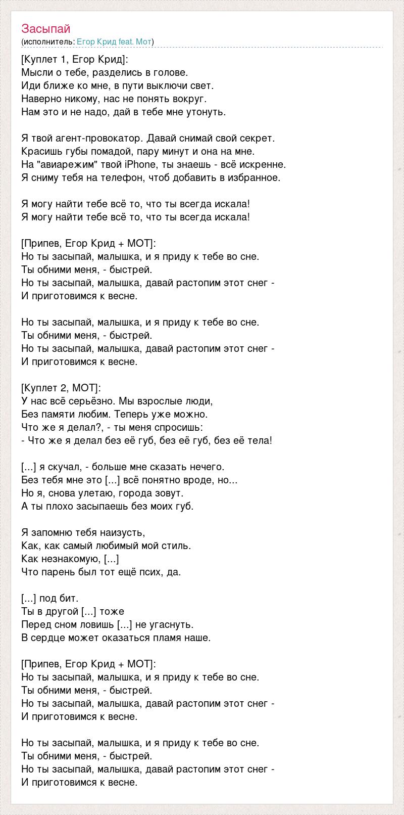 [Куплет 1, Егор Крид]: Мысли о тебе, разделись в голове. Иди ближе ко мне, в пути выключи свет. Наверно никому, нас не понять вокруг. Нам это и не надо, дай в тебе мне утонуть. Я твой агент-провокатор. Давай снимай свой секрет. Красишь губы помадой, пару минут и она на мне. На "авиарежим" твой iPhone, ты знаешь - всё искренне. Я сниму тебя на телефон, чтоб добавить в избранное. Я могу найти тебе всё то, что ты всегда искала! Я могу найти тебе всё то, что ты всегда искала! [Припев, Егор Крид + МОТ]: Но ты засыпай, малышка, и я приду к тебе во сне. Ты обними меня, - быстрей. Но ты засыпай, малышка, давай растопим этот снег - И приготовимся к весне. Но ты засыпай, малышка, и я приду к тебе во сне. Ты обними меня, - быстрей. Но ты засыпай, малышка, давай растопим этот снег - И приготовимся к весне. [Куплет 2, МОТ]: У нас всё серьёзно. Мы взрослые люди, Без памяти любим. Теперь уже можно. Что же я делал?, - ты меня спросишь: - Что же я делал без её губ, без её губ, без её тела! [...] я скучал, - больше мне сказать нечего. Без тебя мне это [...] всё понятно вроде, но... Но я, снова улетаю, города зовут. А ты плохо засыпаешь без моих губ. Я запомню тебя наизусть, Как, как самый любимый мой стиль. Как незнакомую, [...] Что парень был тот ещё псих, да. [...] под бит. Ты в другой [...] тоже Перед сном ловишь [...] не угаснуть. В сердце может оказаться пламя наше. [Припев, Егор Крид + МОТ]: Но ты засыпай, малышка, и я приду к тебе во сне. Ты обними меня, - быстрей. Но ты засыпай, малышка, давай растопим этот снег - И приготовимся к весне. Но ты засыпай, малышка, и я приду к тебе во сне. Ты обними меня, - быстрей. Но ты засыпай, малышка, давай растопим этот снег - И приготовимся к весне.