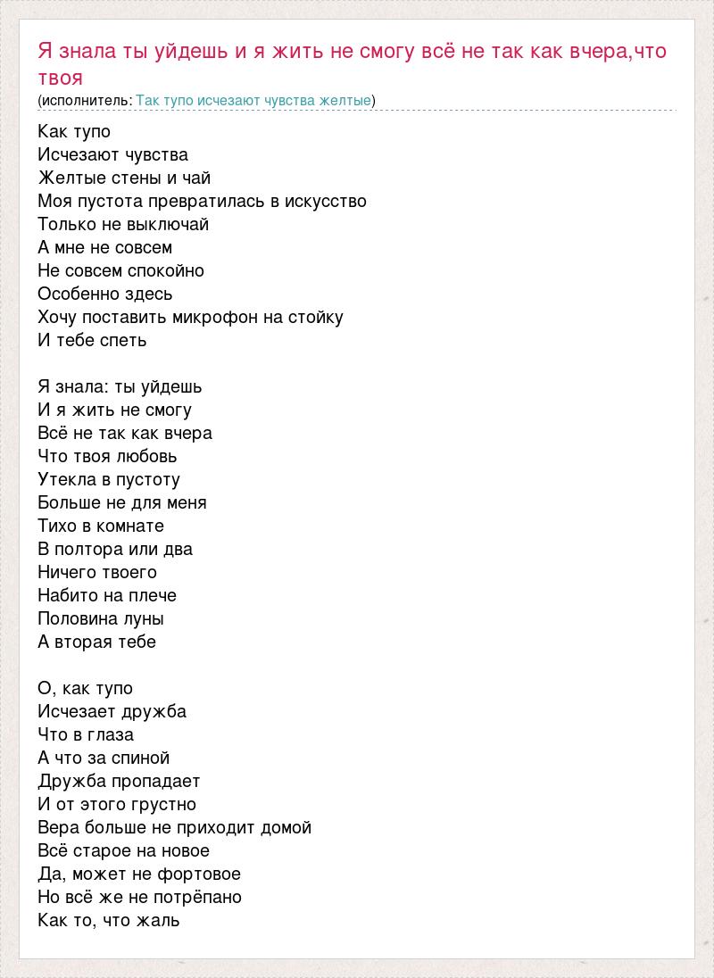 Как тупо Исчезают чувства Желтые стены и чай Моя пустота превратилась в искусство Только не выключай А мне не cовсем Не совсем спокойно Особенно здесь Хочу поставить микрофон на стойку И тебе спеть Я знала: ты уйдешь И я жить не смогу Всё не так как вчера Что твоя любовь Утекла в пустоту Больше не для меня Тихо в комнате В полтора или два Ничего твоего Набито на плече Половина луны А вторая тебе О, как тупо Исчезает дружба Что в глаза А что за спиной Дружба пропадает И от этого грустно Вера больше не приходит домой Всё старое на новое Да, может не фортовое Но всё же не потрёпано Как то, что жаль