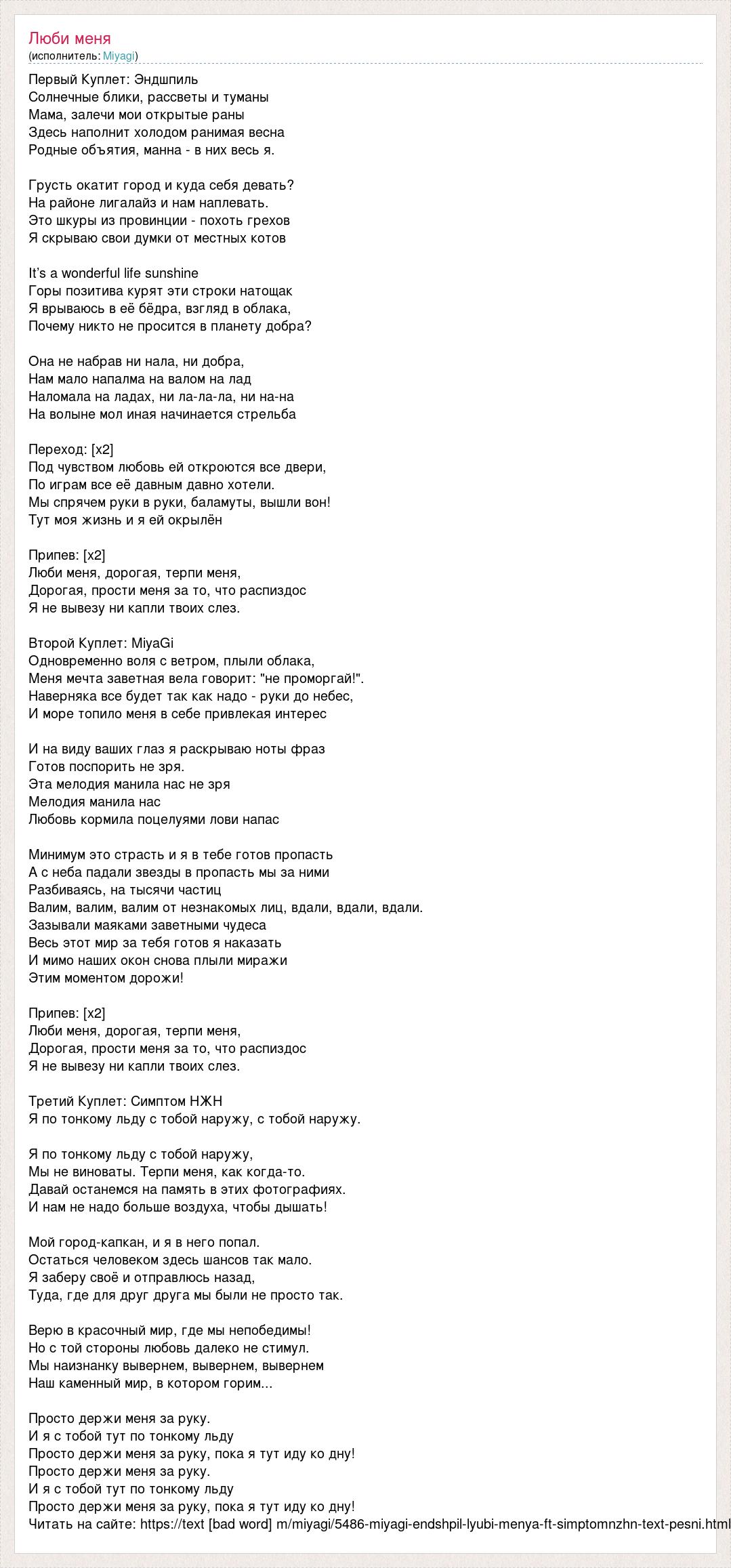 Первый Куплет: Эндшпиль Солнечные блики, рассветы и туманы Мама, залечи мои открытые раны Здесь наполнит холодом ранимая весна Родные объятия, манна - в них весь я. Грусть окатит город и куда себя девать? На районе лигалайз и нам наплевать. Это шкуры из провинции - похоть грехов Я скрываю свои думки от местных котов It’s a wonderful life sunshine Горы позитива курят эти строки натощак Я врываюсь в её бёдра, взгляд в облака, Почему никто не просится в планету добра? Она не набрав ни нала, ни добра, Нам мало напалма на валом на лад Наломала на ладах, ни ла-ла-ла, ни на-на На волыне мол иная начинается стрельба Переход: [х2] Под чувством любовь ей откроются все двери, По играм все её давным давно хотели. Мы спрячем руки в руки, баламуты, вышли вон! Тут моя жизнь и я ей окрылён Припев: [х2] Люби меня, дорогая, терпи меня, Дорогая, прости меня за то, что распиздос Я не вывезу ни капли твоих слез. Второй Куплет: MiyaGi Одновременно воля с ветром, плыли облака, Меня мечта заветная вела говорит: "не проморгай!". Наверняка все будет так как надо - руки до небес, И море топило меня в себе привлекая интерес И на виду ваших глаз я раскрываю ноты фраз Готов поспорить не зря. Эта мелодия манила нас не зря Мелодия манила нас Любовь кормила поцелуями лови напас Минимум это страсть и я в тебе готов пропасть А с неба падали звезды в пропасть мы за ними Разбиваясь, на тысячи частиц Валим, валим, валим от незнакомых лиц, вдали, вдали, вдали. Зазывали маяками заветными чудеса Весь этот мир за тебя готов я наказать И мимо наших окон снова плыли миражи Этим моментом дорожи! Припев: [х2] Люби меня, дорогая, терпи меня, Дорогая, прости меня за то, что распиздос Я не вывезу ни капли твоих слез. Третий Куплет: Симптом НЖН Я по тонкому льду с тобой наружу, с тобой наружу. Я по тонкому льду с тобой наружу, Мы не виноваты. Терпи меня, как когда-то. Давай останемся на память в этих фотографиях. И нам не надо больше воздуха, чтобы дышать! Мой город-капкан, и я в него попал. Остаться человеком здесь шансов так мало. Я заберу своё и отправлюсь назад, Туда, где для друг друга мы были не просто так. Верю в красочный мир, где мы непобедимы! Но с той стороны любовь далеко не стимул. Мы наизнанку вывернем, вывернем, вывернем Наш каменный мир, в котором горим... Просто держи меня за руку. И я с тобой тут по тонкому льду Просто держи меня за руку, пока я тут иду ко дну! Просто держи меня за руку. И я с тобой тут по тонкому льду Просто держи меня за руку, пока я тут иду ко дну! Читать на сайте: https://text [bad word] m/miyagi/5486-miyagi-endshpil-lyubi-menya-ft-simptomnzhn-text-pesni.html