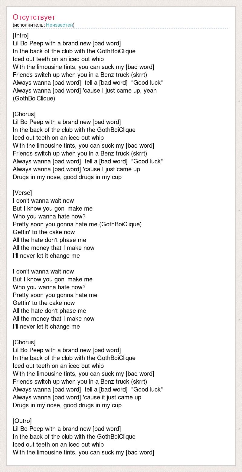 [Intro] Lil Bo Peep with a brand new [bad word] In the back of the club with the GothBoiClique Iced out teeth on an iced out whip With the limousine tints, you can suck my [bad word] Friends switch up when you in a Benz truck (skrrt) Always wanna [bad word] tell a [bad word] "Good luck" Always wanna [bad word] 'cause I just came up, yeah (GothBoiClique) [Chorus] Lil Bo Peep with a brand new [bad word] In the back of the club with the GothBoiClique Iced out teeth on an iced out whip With the limousine tints, you can suck my [bad word] Friends switch up when you in a Benz truck (skrrt) Always wanna [bad word] tell a [bad word] "Good luck" Always wanna [bad word] 'cause I just came up Drugs in my nose, good drugs in my cup [Verse] I don't wanna wait now But I know you gon' make me Who you wanna hate now? Pretty soon you gonna hate me (GothBoiClique) Gettin' to the cake now All the hate don't phase me All the money that I make now I'll never let it change me I don't wanna wait now But I know you gon' make me Who you wanna hate now? Pretty soon you gonna hate me Gettin' to the cake now All the hate don't phase me All the money that I make now I'll never let it change me [Chorus] Lil Bo Peep with a brand new [bad word] In the back of the club with the GothBoiClique Iced out teeth on an iced out whip With the limousine tints, you can suck my [bad word] Friends switch up when you in a Benz truck (skrrt) Always wanna [bad word] tell a [bad word] "Good luck" Always wanna [bad word] 'cause it just came up Drugs in my nose, good drugs in my cup [Outro] Lil Bo Peep with a brand new [bad word] In the back of the club with the GothBoiClique Iced out teeth on an iced out whip With the limousine tints, you can suck my [bad word]