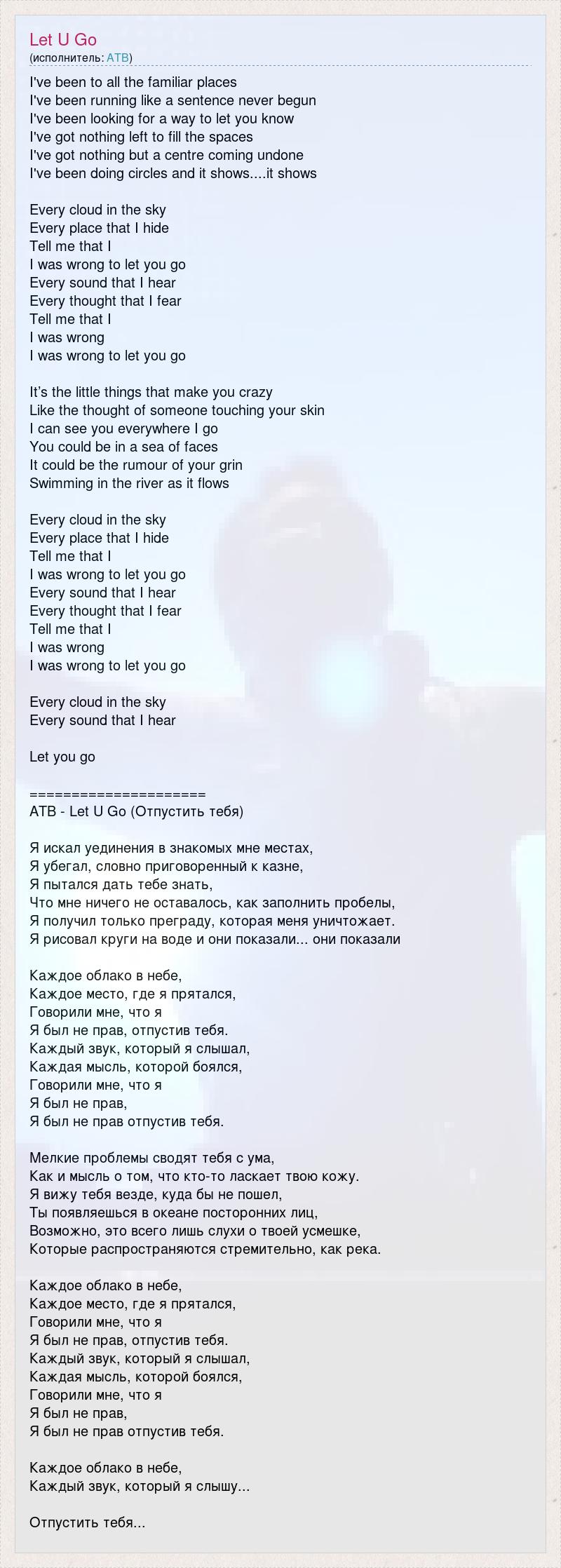 I've been to all the familiar places I've been running like a sentence never begun I've been looking for a way to let you know I've got nothing left to fill the spaces I've got nothing but a centre coming undone I've been doing circles and it shows....it shows Every cloud in the sky Every place that I hide Tell me that I I was wrong to let you go Every sound that I hear Every thought that I fear Tell me that I I was wrong I was wrong to let you go It’s the little things that make you crazy Like the thought of someone touching your skin I can see you everywhere I go You could be in a sea of faces It could be the rumour of your grin Swimming in the river as it flows Every cloud in the sky Every place that I hide Tell me that I I was wrong to let you go Every sound that I hear Every thought that I fear Tell me that I I was wrong I was wrong to let you go Every cloud in the sky Every sound that I hear Let you go ===================== ATB - Let U Go (Отпустить тебя) Я искал уединения в знакомых мне местах, Я убегал, словно приговоренный к казне, Я пытался дать тебе знать, Что мне ничего не оставалось, как заполнить пробелы, Я получил только преграду, которая меня уничтожает. Я рисовал круги на воде и они показали... они показали Каждое облако в небе, Каждое место, где я прятался, Говорили мне, что я Я был не прав, отпустив тебя. Каждый звук, который я слышал, Каждая мысль, которой боялся, Говорили мне, что я Я был не прав, Я был не прав отпустив тебя. Мелкие проблемы сводят тебя с ума, Как и мысль о том, что кто-то ласкает твою кожу. Я вижу тебя везде, куда бы не пошел, Ты появляешься в океане посторонних лиц, Возможно, это всего лишь слухи о твоей усмешке, Которые распространяются стремительно, как река. Каждое облако в небе, Каждое место, где я прятался, Говорили мне, что я Я был не прав, отпустив тебя. Каждый звук, который я слышал, Каждая мысль, которой боялся, Говорили мне, что я Я был не прав, Я был не прав отпустив тебя. Каждое облако в небе, Каждый звук, который я слышу... Отпустить тебя...