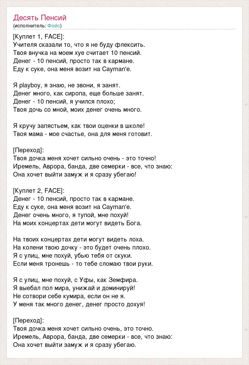 [Куплет 1, FACE]: Учителя сказали то, что я не буду флексить. Твоя внучка на моем хуе считает 10 пенсий. Денег - 10 пенсий, просто так в кармане. Еду к суке, она меня возит на Cayman'е. Я playboy, я знаю, не звони, я занят. Денег много, как сиропа, еще больше занят. Денег - 10 пенсий, я учился плохо; Твоя дочь со мной, моих денег очень много. Я кручу запястьем, как твои оценки в школе! Твоя мама - мое счастье, она для меня готовит. [Переход]: Твоя дочка меня хочет сильно очень - это точно! Иремель, Аврора, банда, две семерки - все, что знаю: Она хочет выйти замуж и я сразу убегаю! [Куплет 2, FACE]: Денег - 10 пенсий, просто так в кармане. Еду к суке, она меня возит на Cayman'е. Денег очень много, я тупой, мне похуй! На моих концертах дети могут видеть Бога. На твоих концертах дети могут видеть лоха. На колени твою дочку - это будет очень плохо. Я с улиц, мне похуй, убью тебя от скуки. Если меня тронешь - то тебе сломаю твои руки. Я с улиц, мне похуй, с Уфы, как Земфира. Я выебал пол мира, унижай и доминируй! Не сотвори себе кумира, если он не я. У меня так много денег, денег просто дохуя! [Переход]: Твоя дочка меня хочет сильно очень, это точно. Иремель, Аврора, банда, две семерки - все, что знаю: Она хочет выйти замуж и я сразу убегаю.