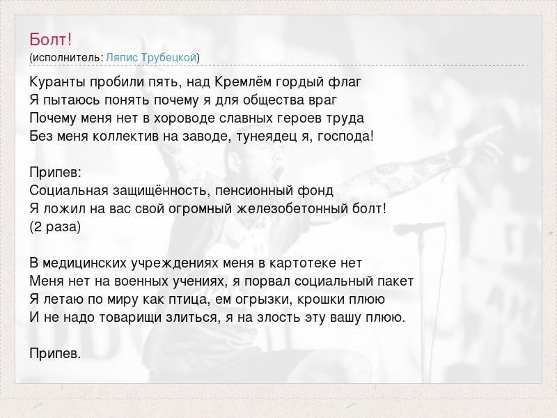 Куранты пробили пять, над Кремлём гордый флаг Я пытаюсь понять почему я для общества враг Почему меня нет в хороводе славных героев труда Без меня коллектив на заводе, тунеядец я, господа! Припев: Социальная защищённость, пенсионный фонд Я ложил на вас свой огромный железобетонный болт! (2 раза) В медицинских учреждениях меня в картотеке нет Меня нет на военных учениях, я порвал социальный пакет Я летаю по миру как птица, ем огрызки, крошки плюю И не надо товарищи злиться, я на злость эту вашу плюю. Припев.