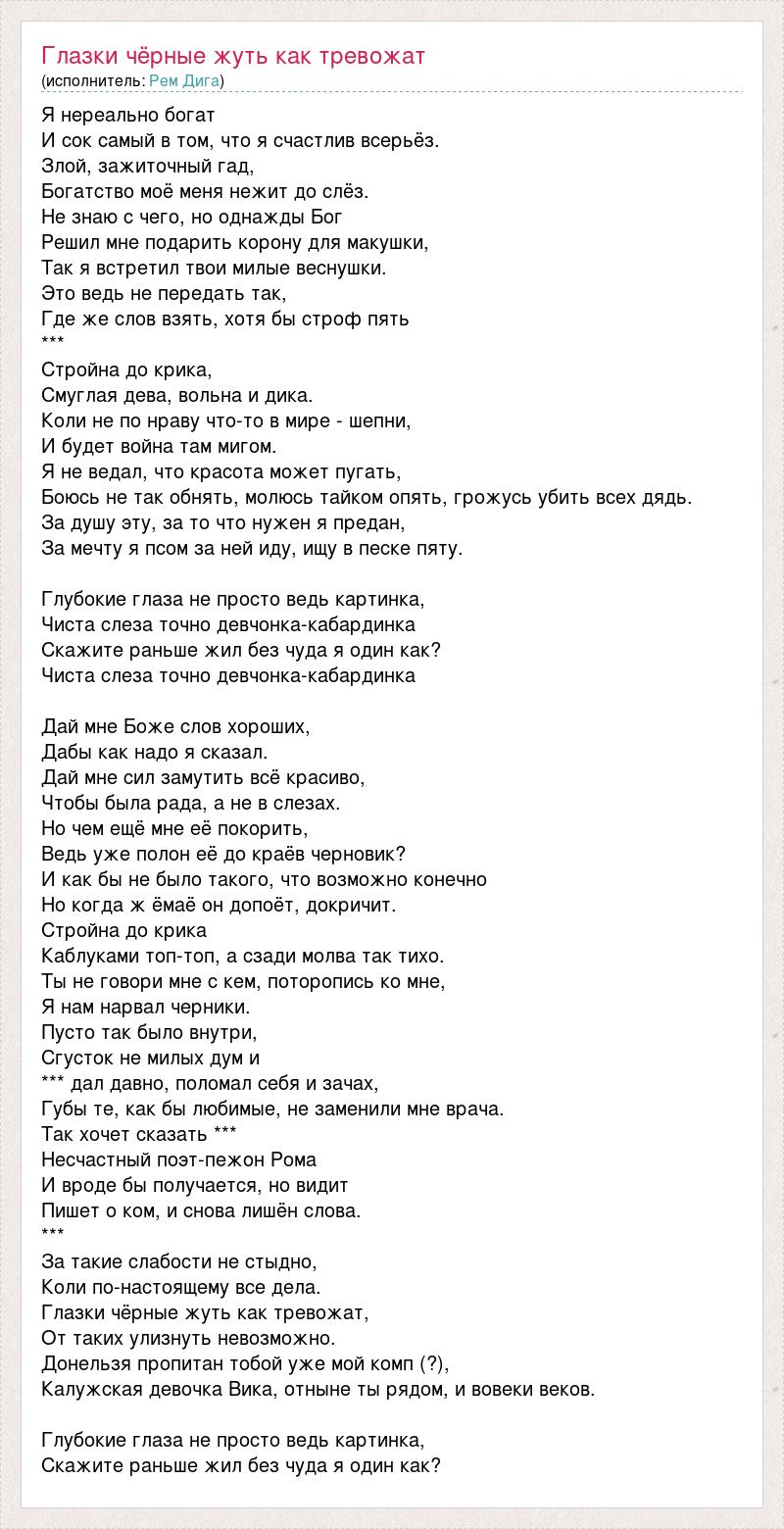 Я нереально богат И сок самый в том, что я счастлив всерьёз. Злой, зажиточный гад, Богатство моё меня нежит до слёз. Не знаю с чего, но однажды Бог Решил мне подарить корону для макушки, Так я встретил твои милые веснушки. Это ведь не передать так, Где же слов взять, хотя бы строф пять *** Стройна до крика, Смуглая дева, вольна и дика. Коли не по нраву что-то в мире - шепни, И будет война там мигом. Я не ведал, что красота может пугать, Боюсь не так обнять, молюсь тайком опять, грожусь убить всех дядь. За душу эту, за то что нужен я предан, За мечту я псом за ней иду, ищу в песке пяту. Глубокие глаза не просто ведь картинка, Чиста слеза точно девчонка-кабардинка Скажите раньше жил без чуда я один как? Чиста слеза точно девчонка-кабардинка Дай мне Боже слов хороших, Дабы как надо я сказал. Дай мне сил замутить всё красиво, Чтобы была рада, а не в слезах. Но чем ещё мне её покорить, Ведь уже полон её до краёв черновик? И как бы не было такого, что возможно конечно Но когда ж ёмаё он допоёт, докричит. Стройна до крика Каблуками топ-топ, а сзади молва так тихо. Ты не говори мне с кем, поторопись ко мне, Я нам нарвал черники. Пусто так было внутри, Сгусток не милых дум и *** дал давно, поломал себя и зачах, Губы те, как бы любимые, не заменили мне врача. Так хочет сказать *** Несчастный поэт-пежон Рома И вроде бы получается, но видит Пишет о ком, и снова лишён слова. *** За такие слабости не стыдно, Коли по-настоящему все дела. Глазки чёрные жуть как тревожат, От таких улизнуть невозможно. Донельзя пропитан тобой уже мой комп (?), Калужская девочка Вика, отныне ты рядом, и вовеки веков. Глубокие глаза не просто ведь картинка, Скажите раньше жил без чуда я один как?